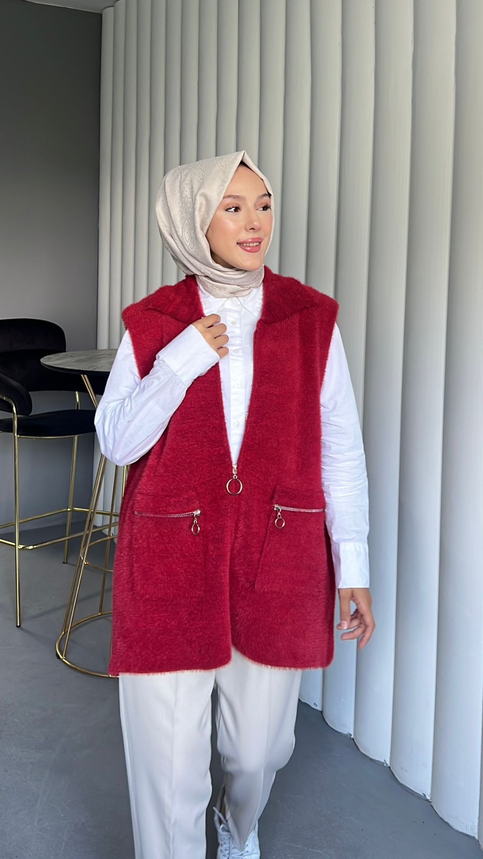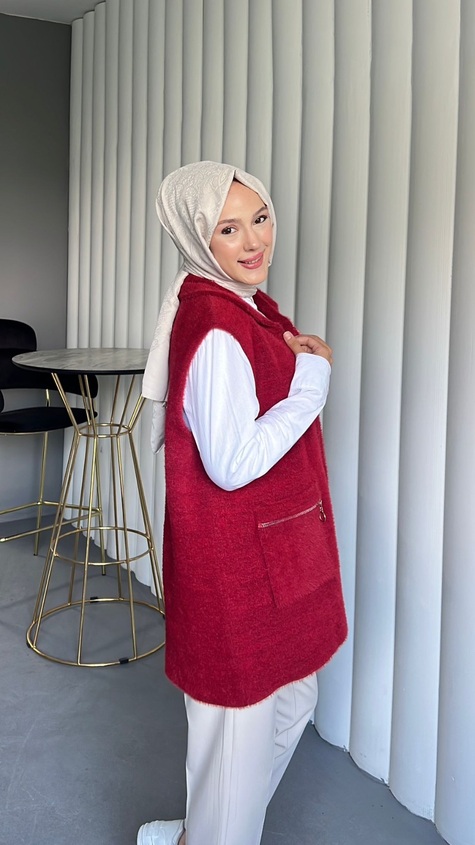 Önü Fermuarlı Torba Cepli Sakallı Yelek -Kırmızı-Kırmızı
