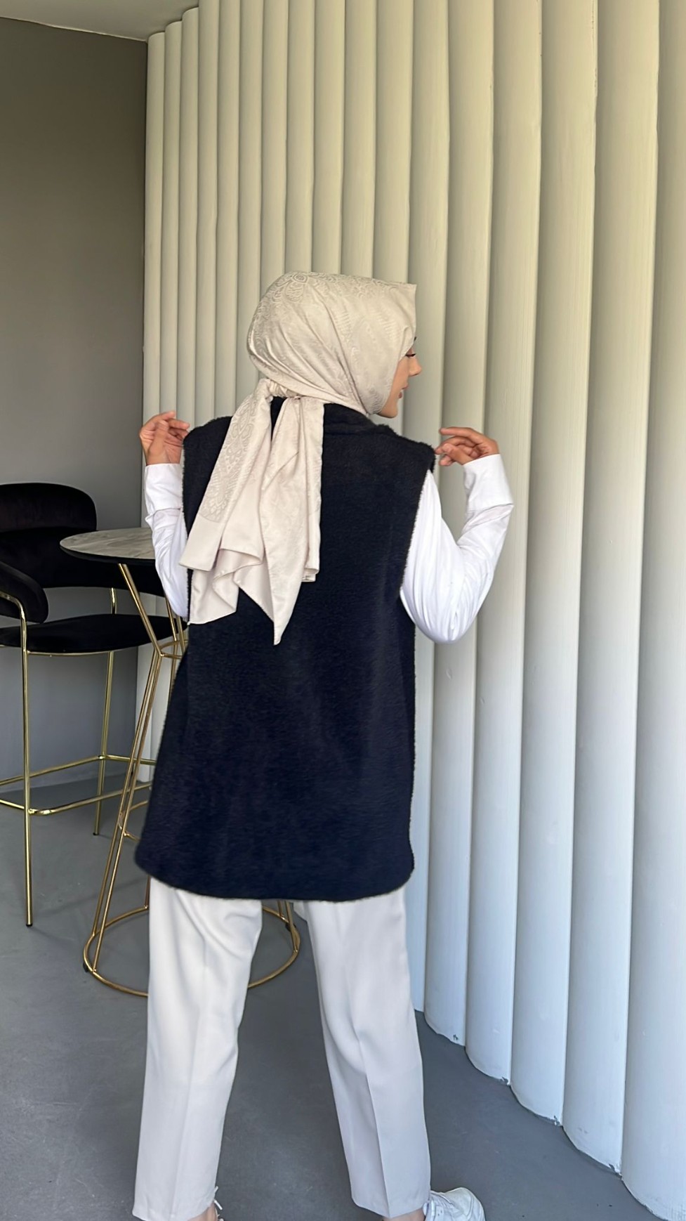 Önü Fermuarlı Torba Cepli Sakallı Yelek -Siyah-siyah