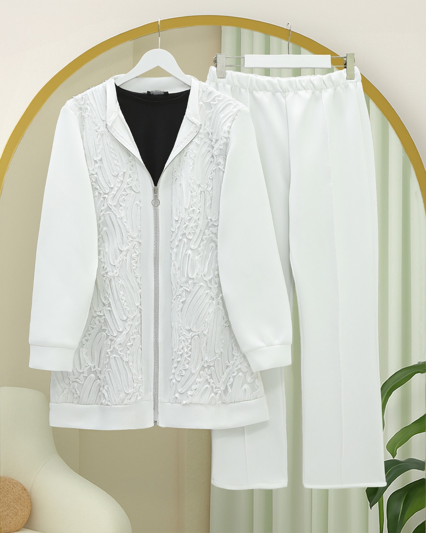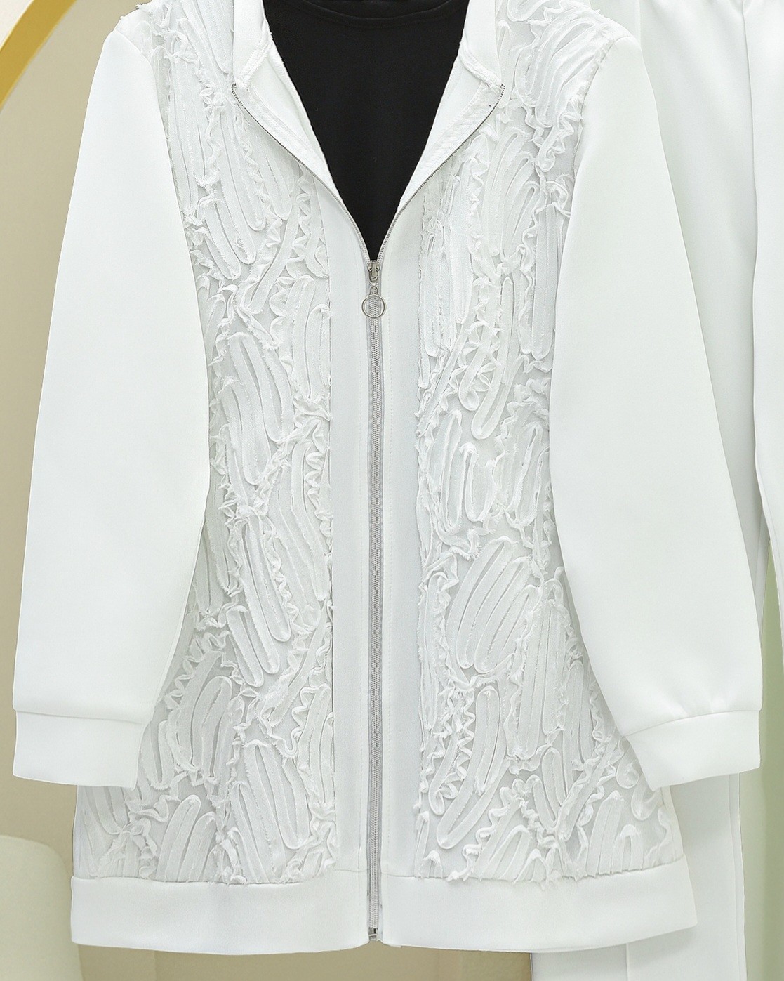 Önü Fermuarlı Tül Detaylı Scuba Takım -Beyaz-Beyaz