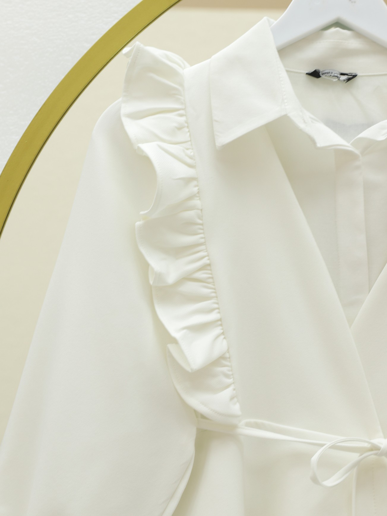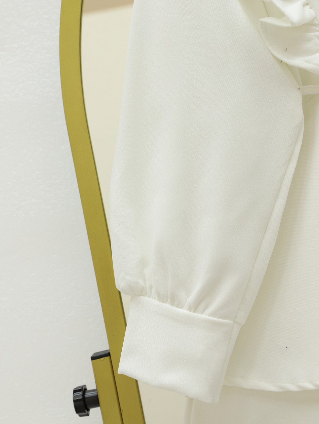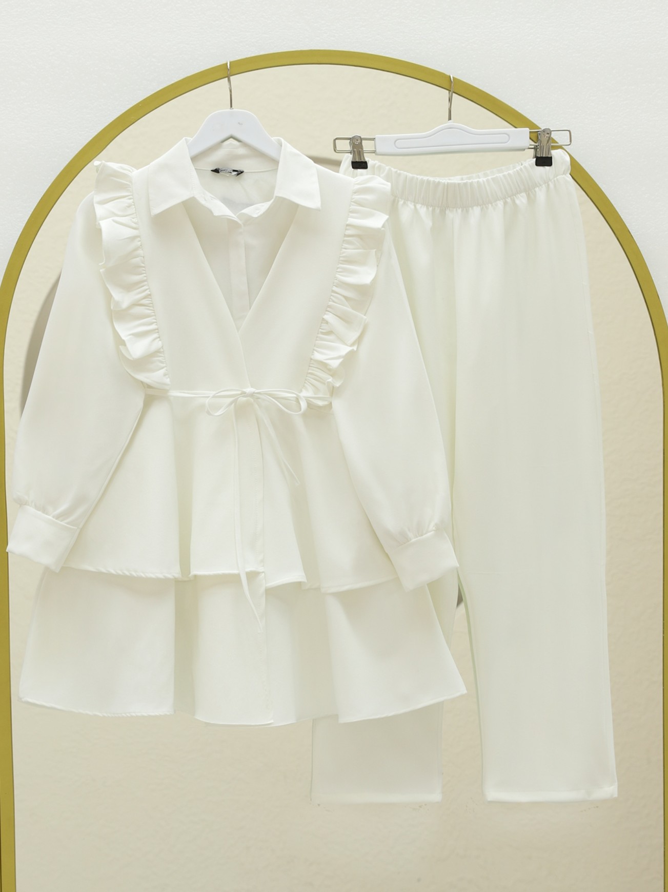 Önü Fırfırlı Bağcıklı Eteği Katlı Pantolonlu Kimono Takım -Beyaz-Beyaz