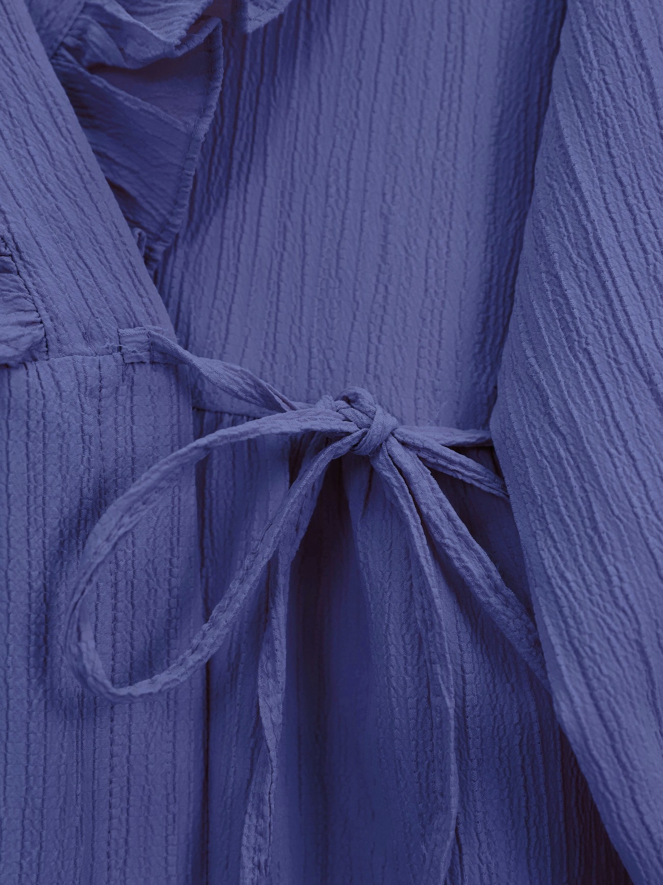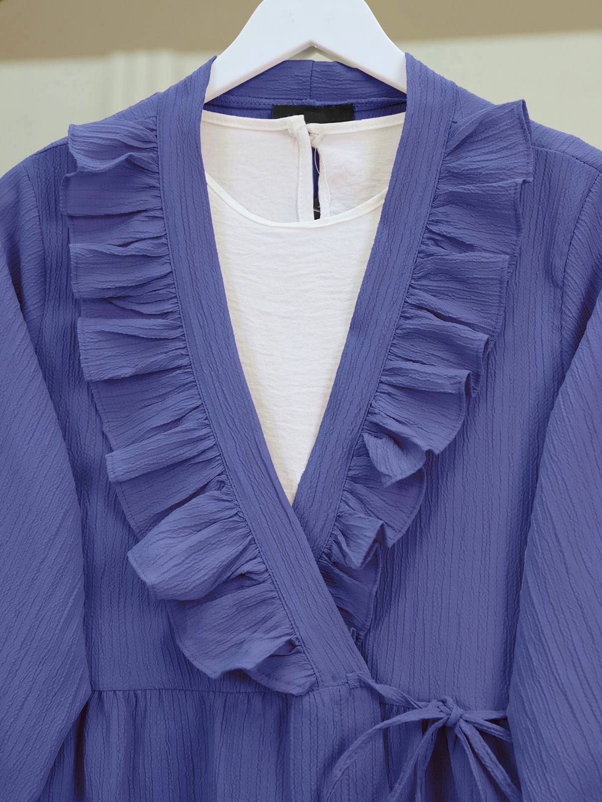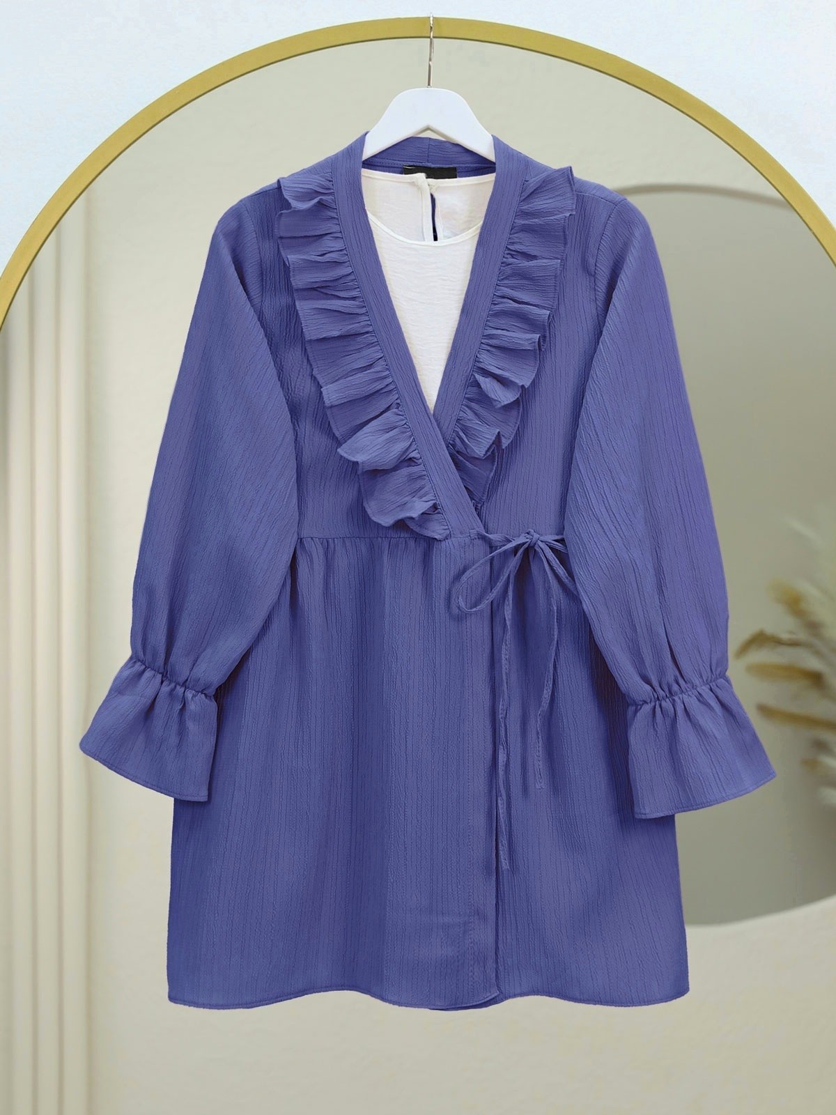 Önü Fırfırlı Bağlamalı Krinkıl Kimono -Mavi-Mavi