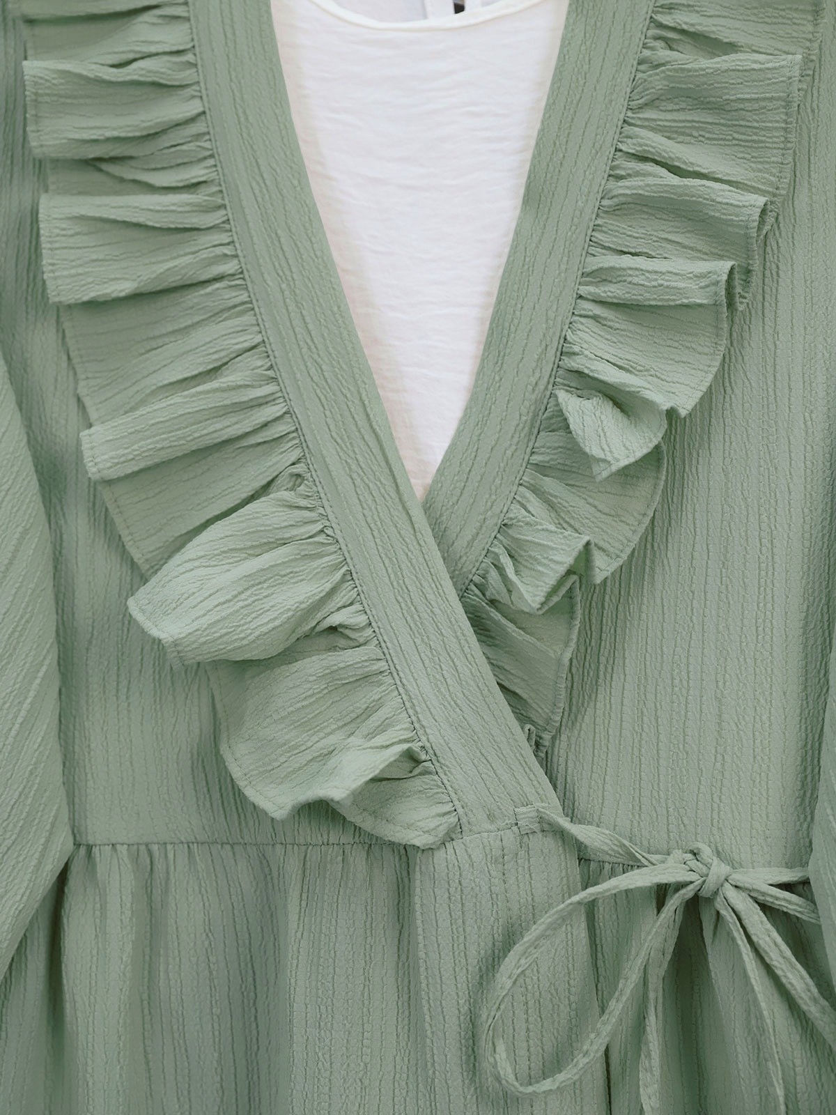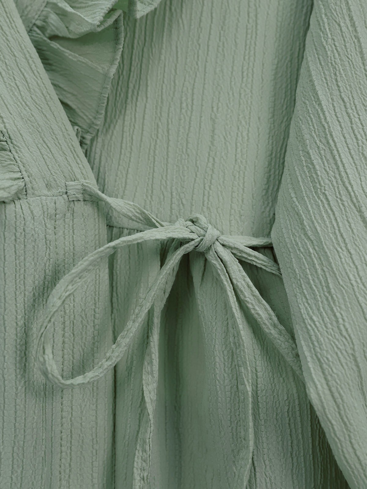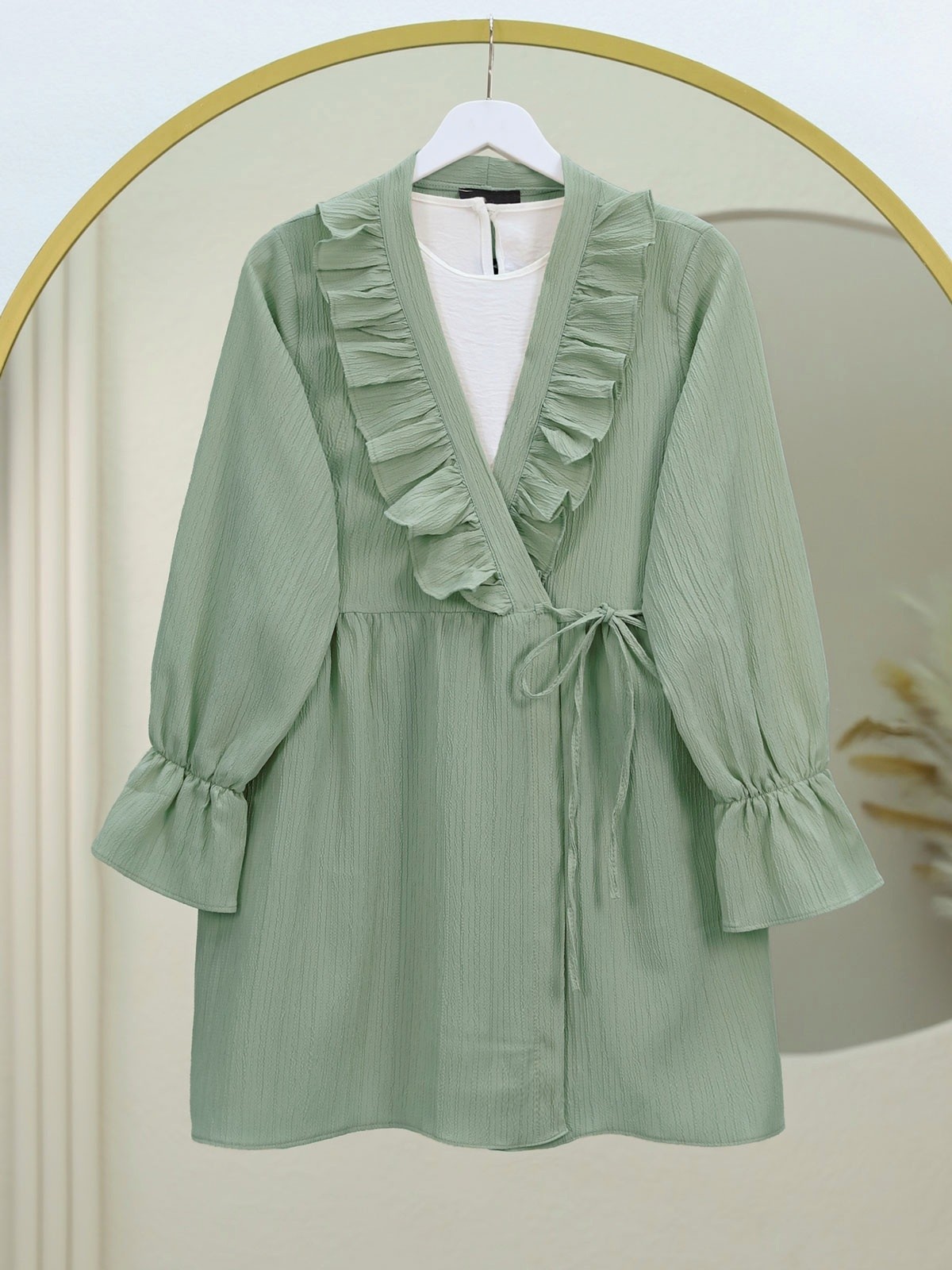 Önü Fırfırlı Bağlamalı Krinkıl Kimono -Mint-Mint