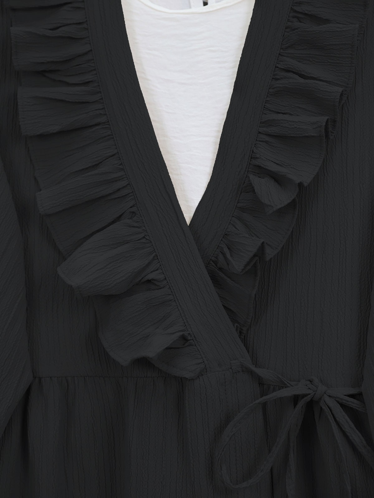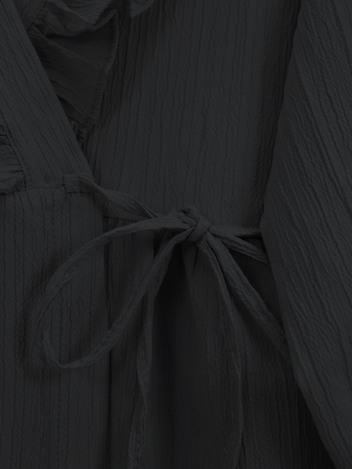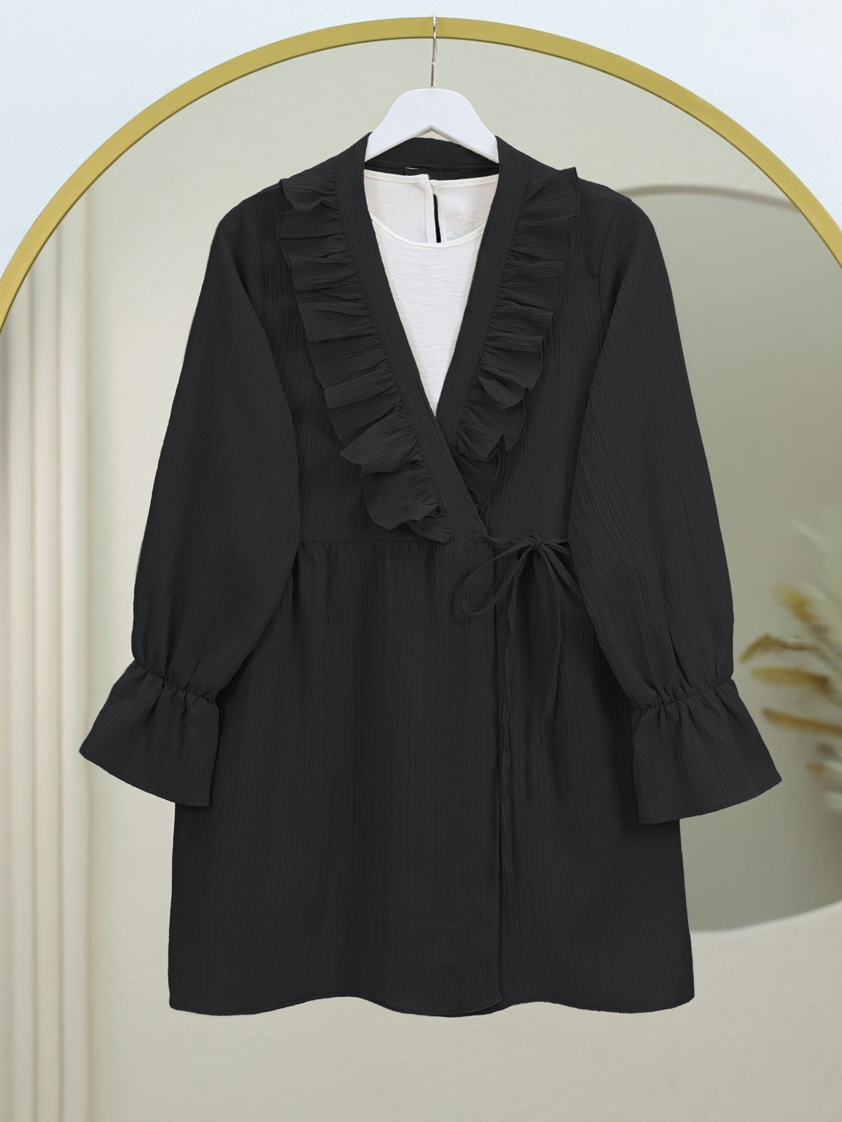Önü Fırfırlı Bağlamalı Krinkıl Kimono -Siyah-siyah