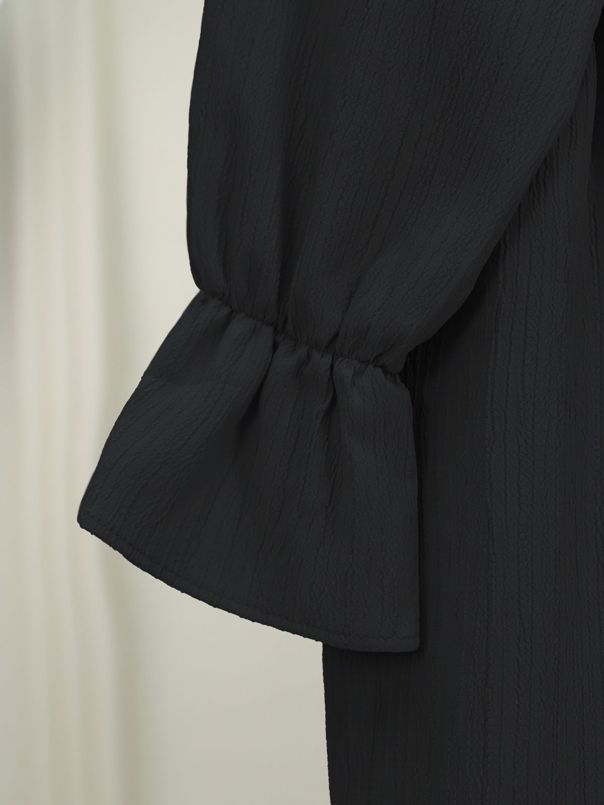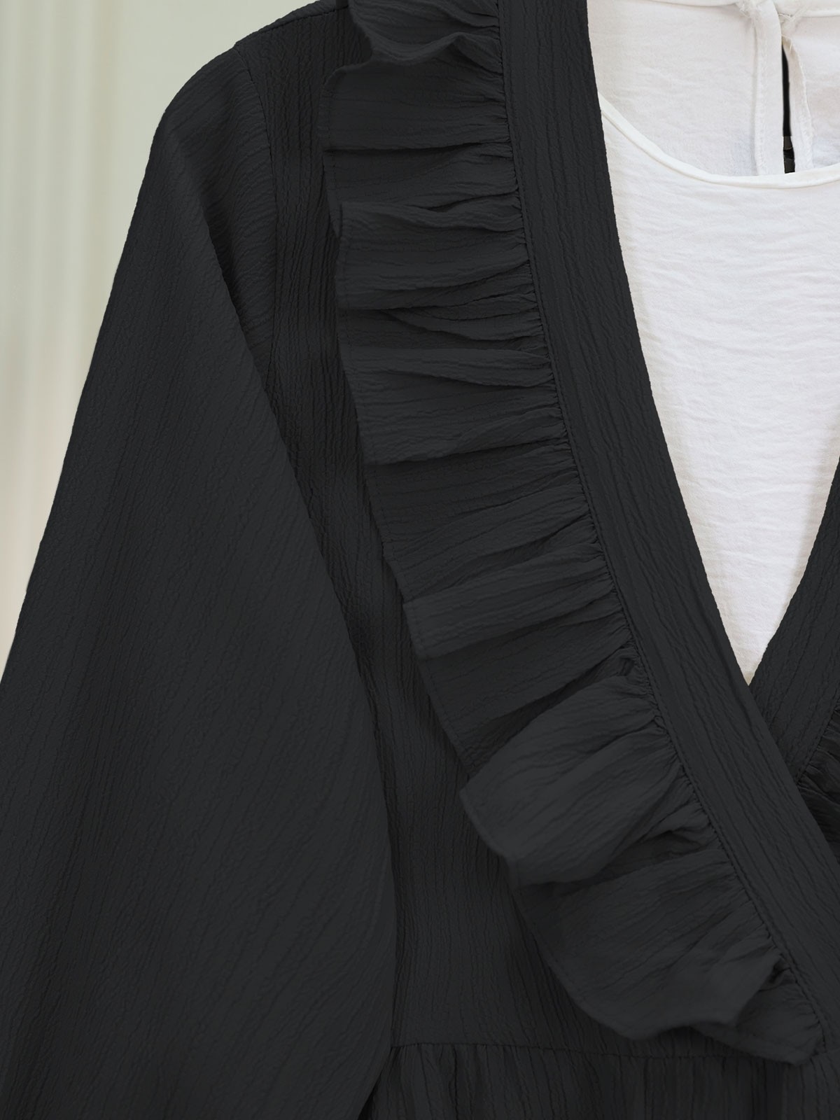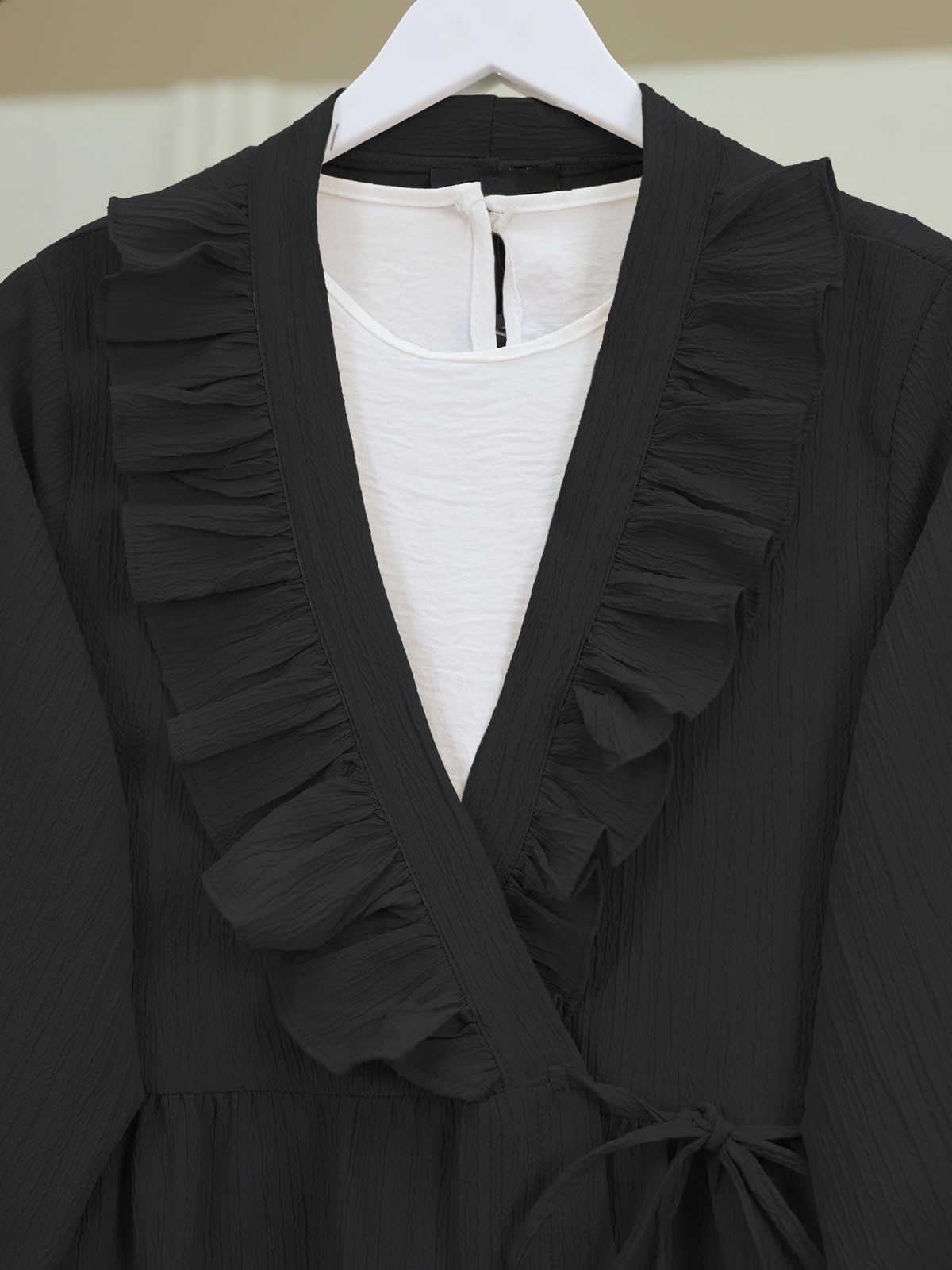Önü Fırfırlı Bağlamalı Krinkıl Kimono -Siyah-siyah