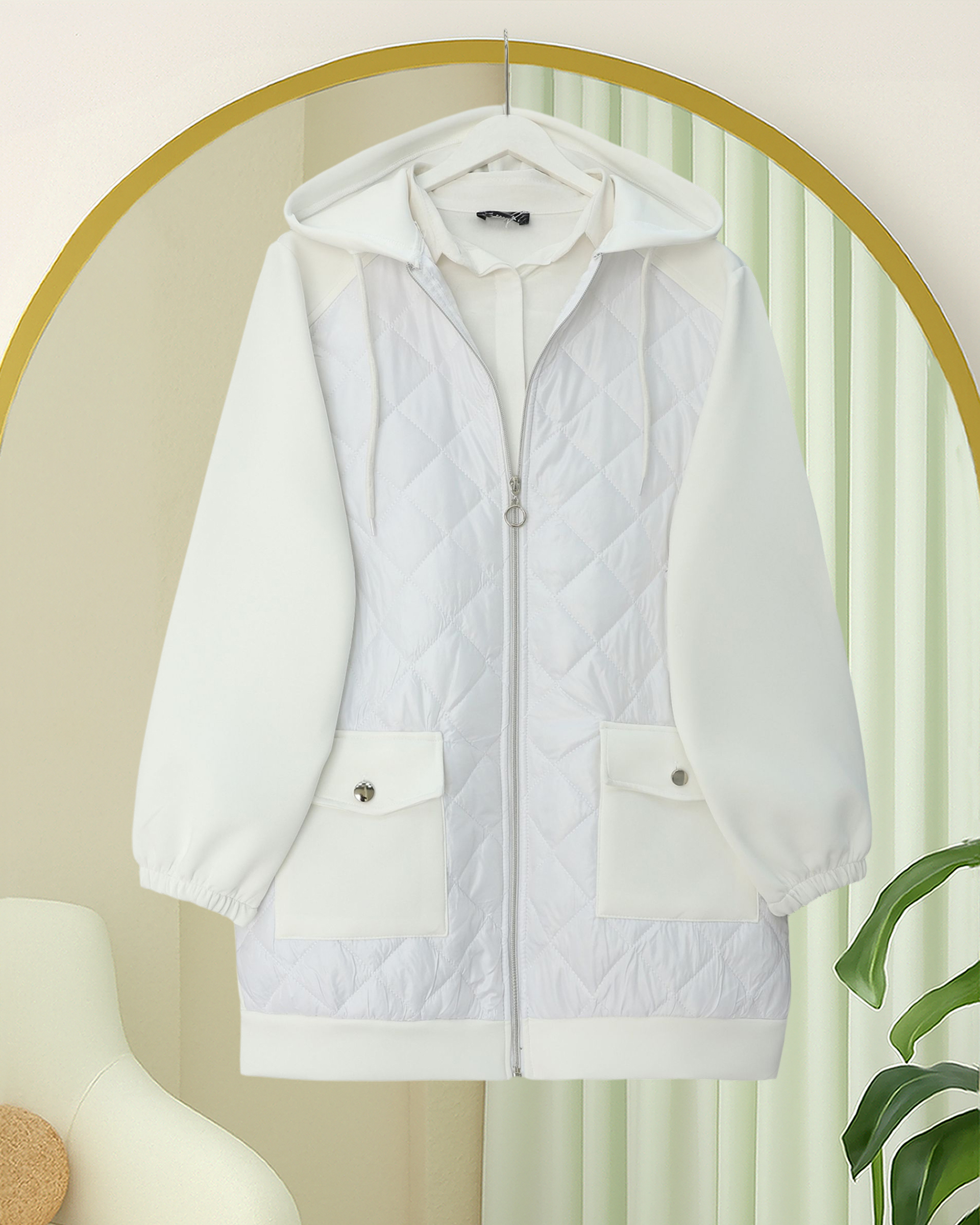 Önü Kapitone Detaylı Kapşonlu Cepli Scuba Sweat -Beyaz-Beyaz
