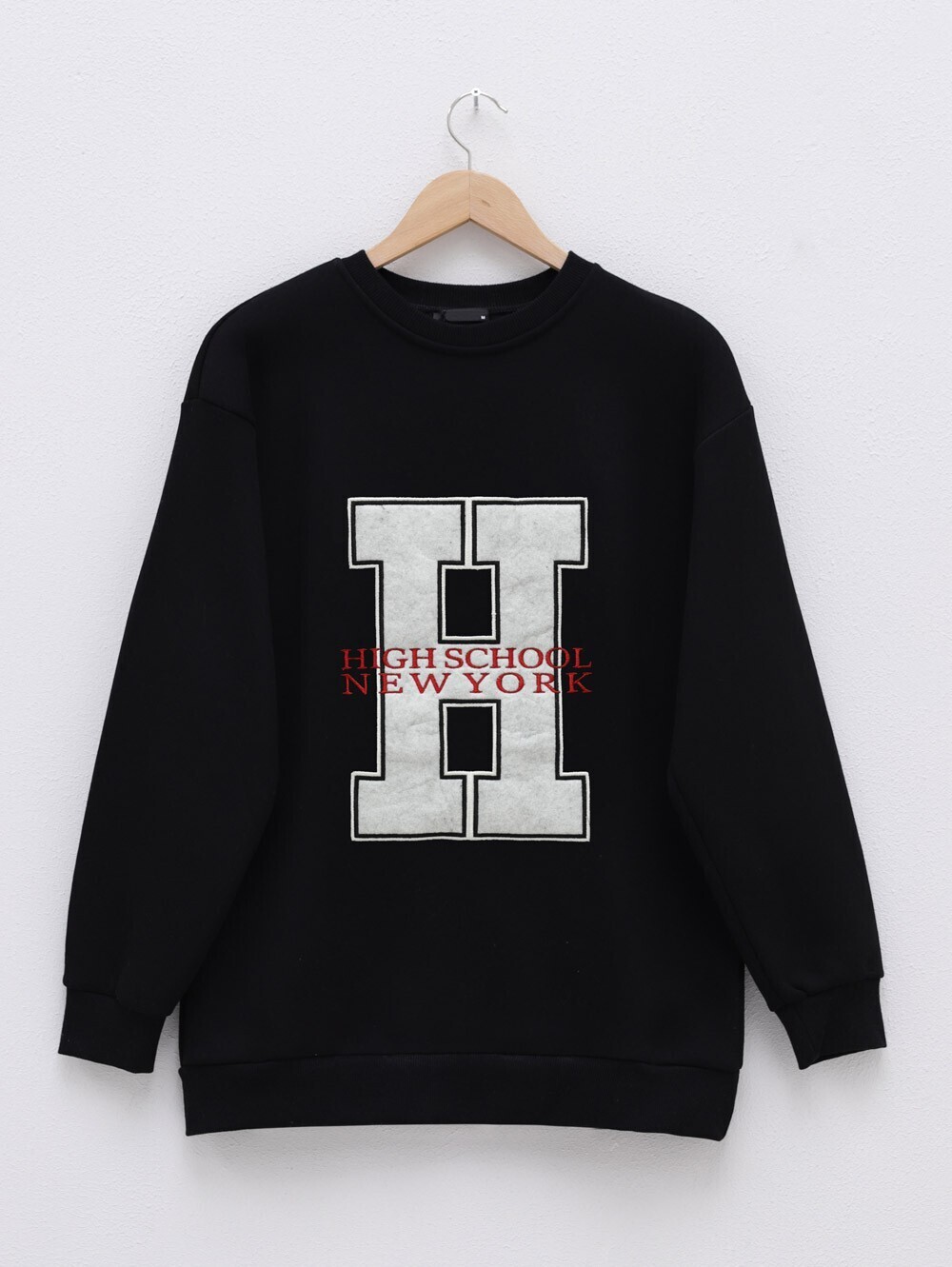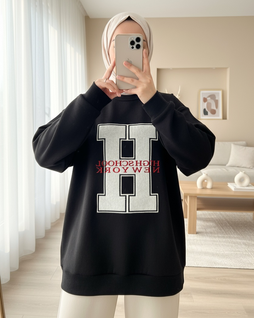 Önü Nakışlı Bisiklet Yaka Sweat Tunik -Siyah-Siyah