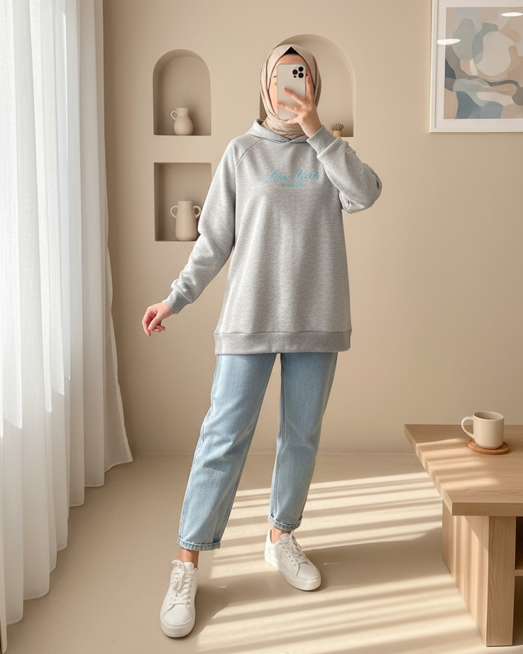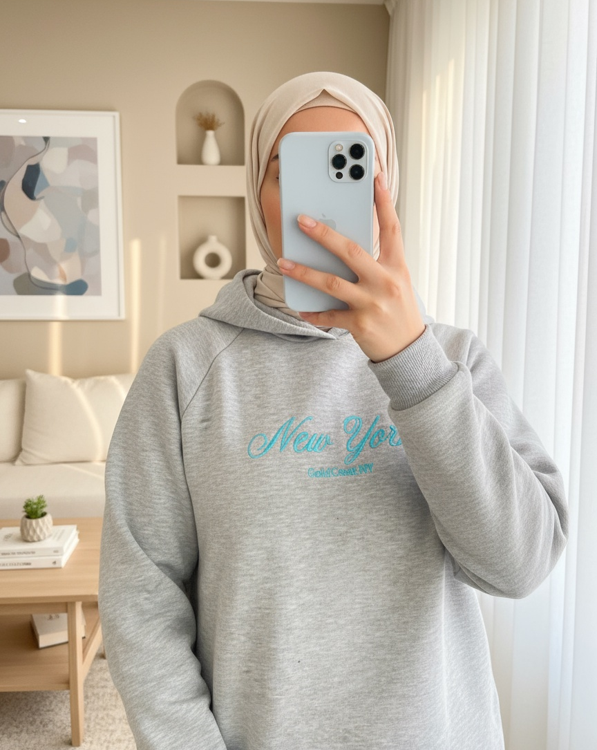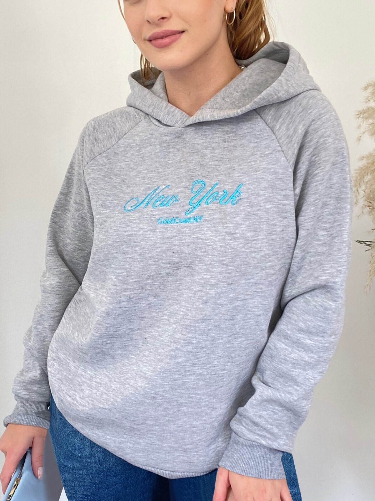 Önü Nakışlı Kapşonlu Sweat -Gri-Gri