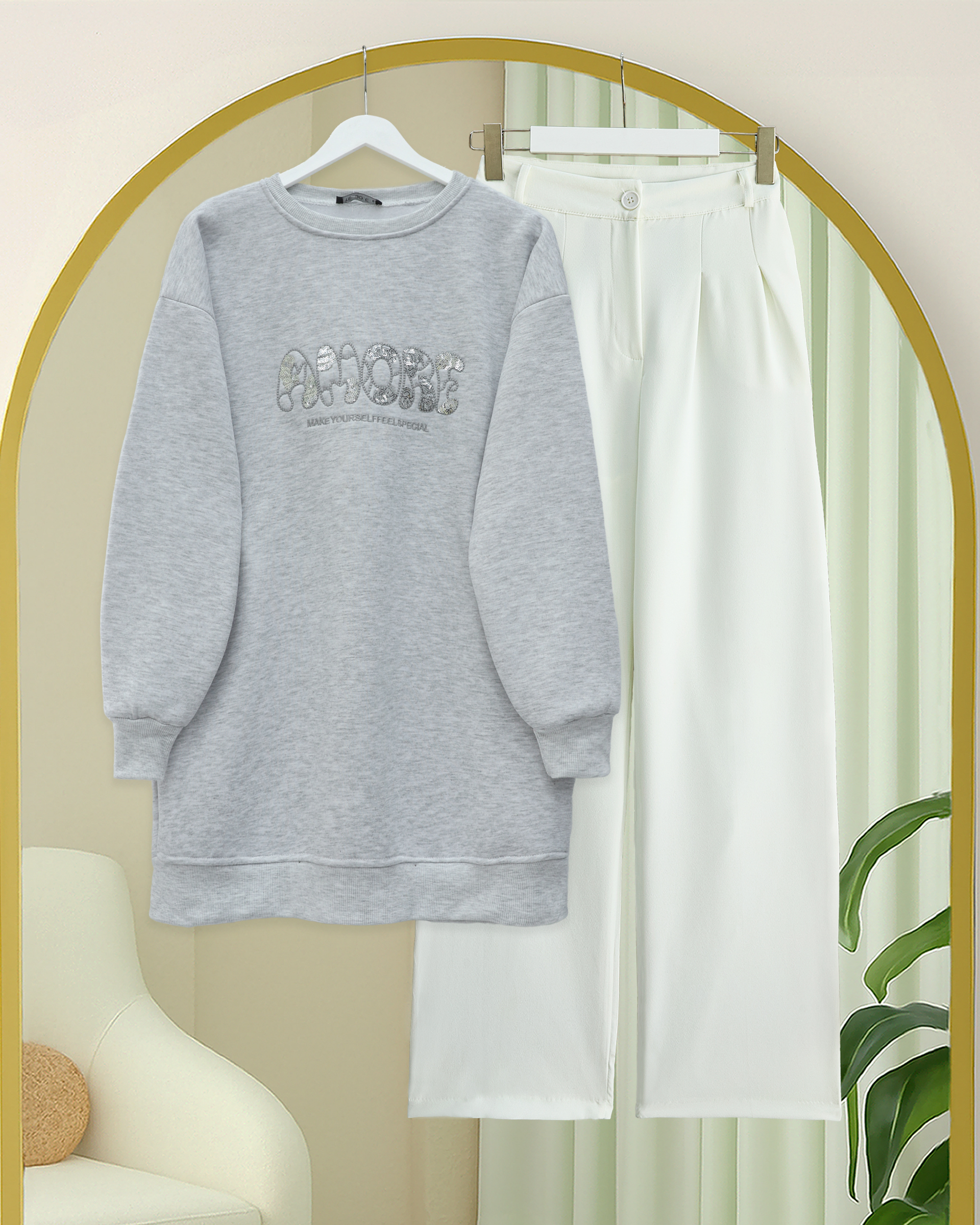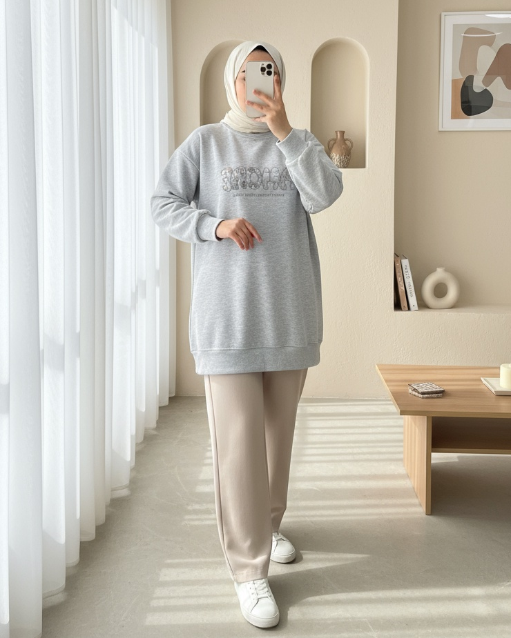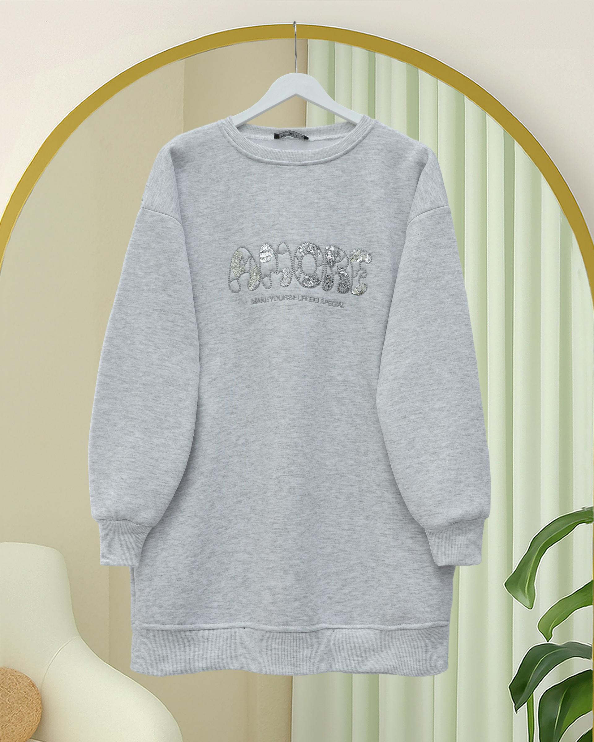 Önü Pul Payet Detaylı Yazılı Üç İplik Sweat -Açık Gri-Açık Gri