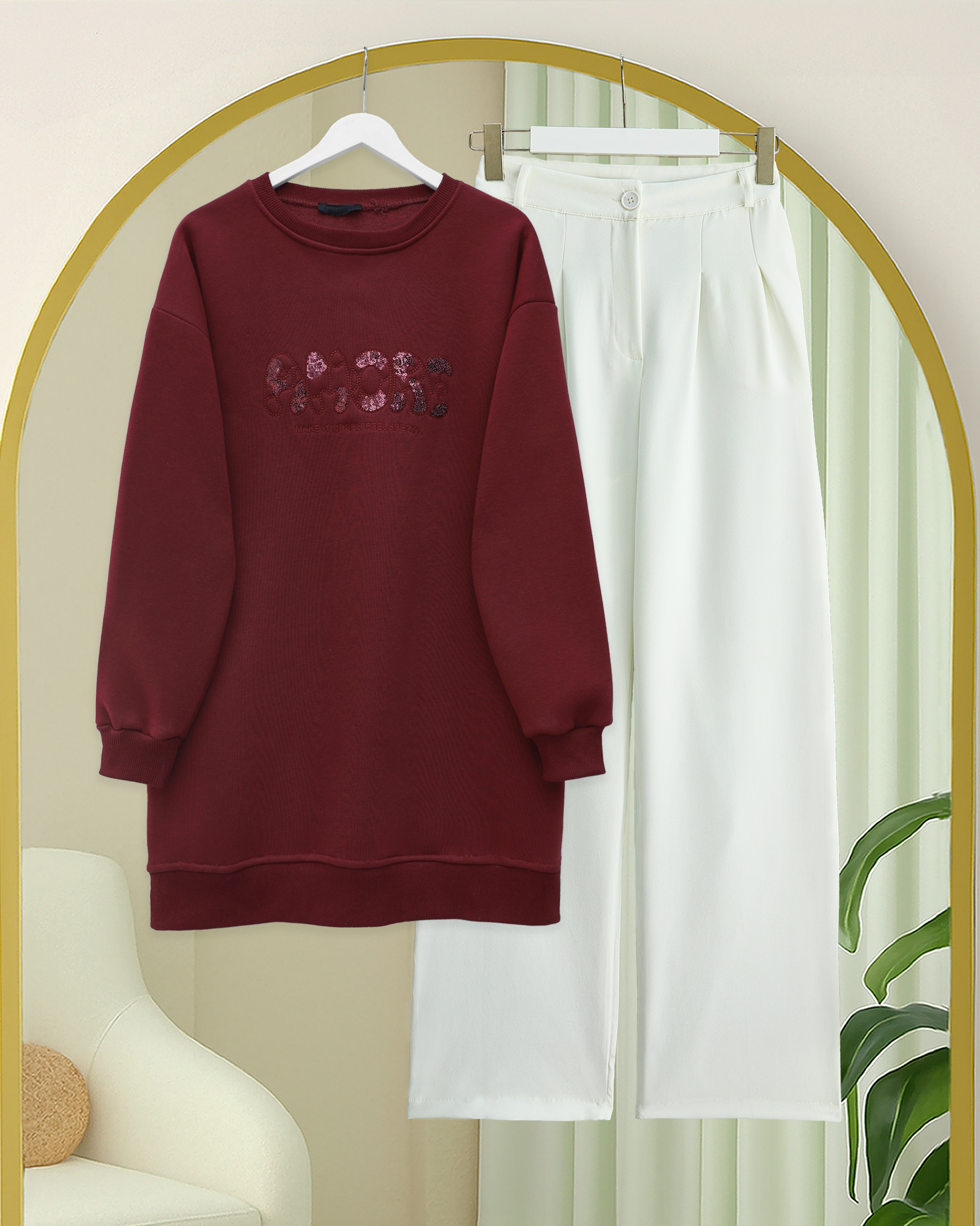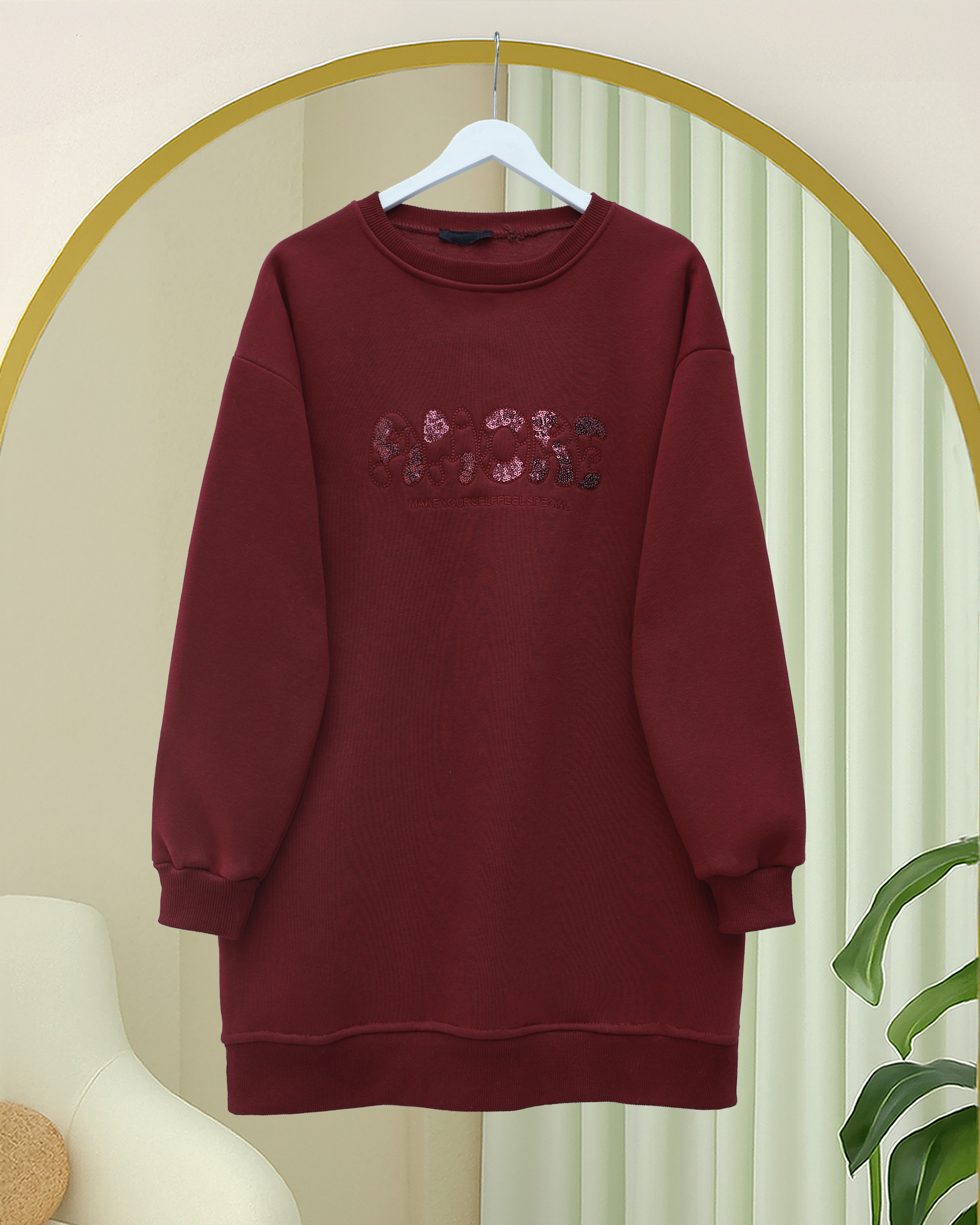 Önü Pul Payet Detaylı Yazılı Üç İplik Sweat -Bordo-Bordo