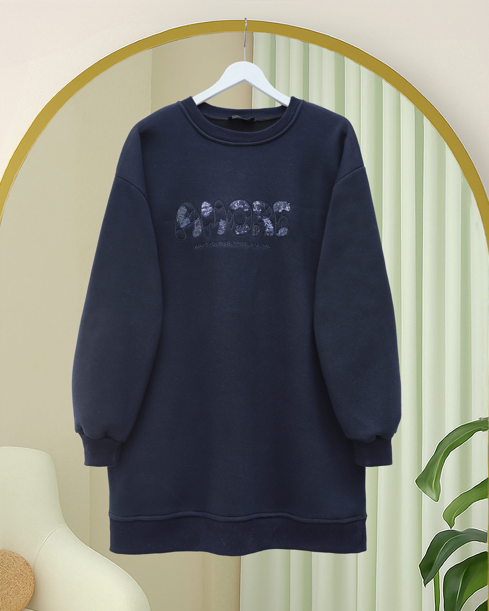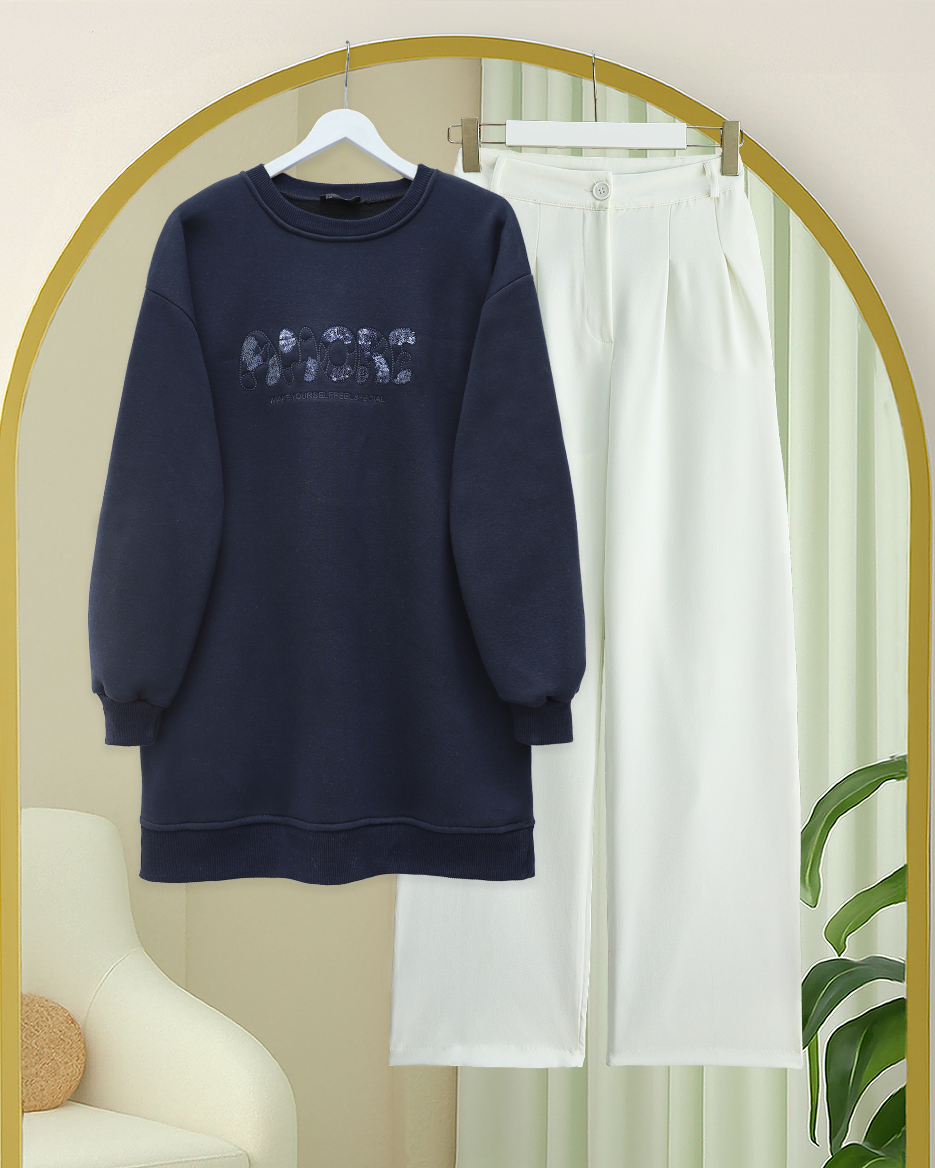 Önü Pul Payet Detaylı Yazılı Üç İplik Sweat -Laci-Lacivert