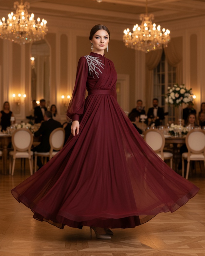 Önü Taş Detaylı Drapeli Kemerli Tül Abiye -Bordo-Bordo