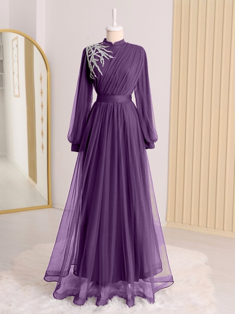 Önü Taş Detaylı Drapeli Kemerli Tül Abiye -Mor-Mor