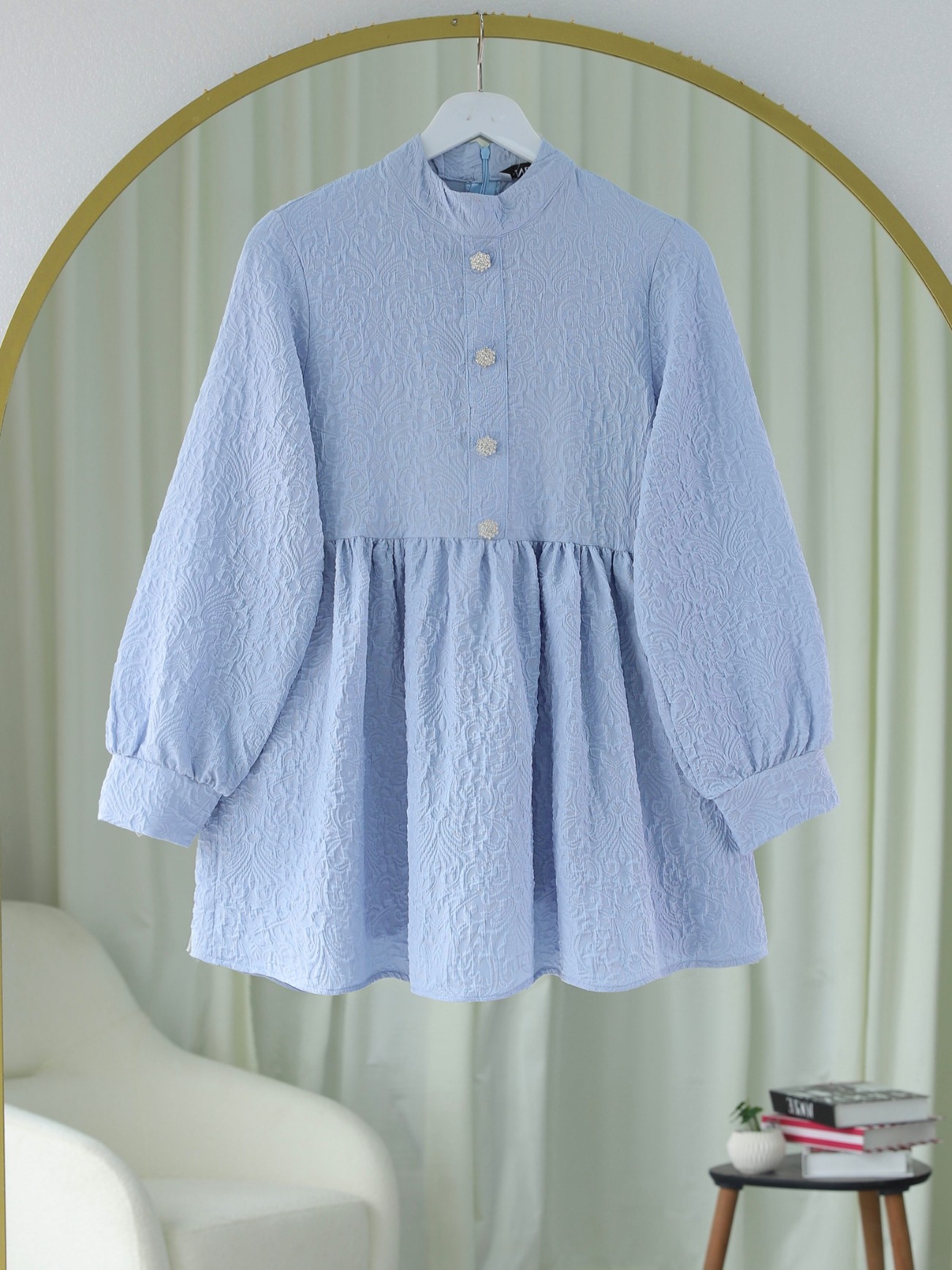 Önü Taşlı Düğme Detaylı Parçalı Arkası Fermuarlı Tunik -Bebe Mavi-Bebe Mavi