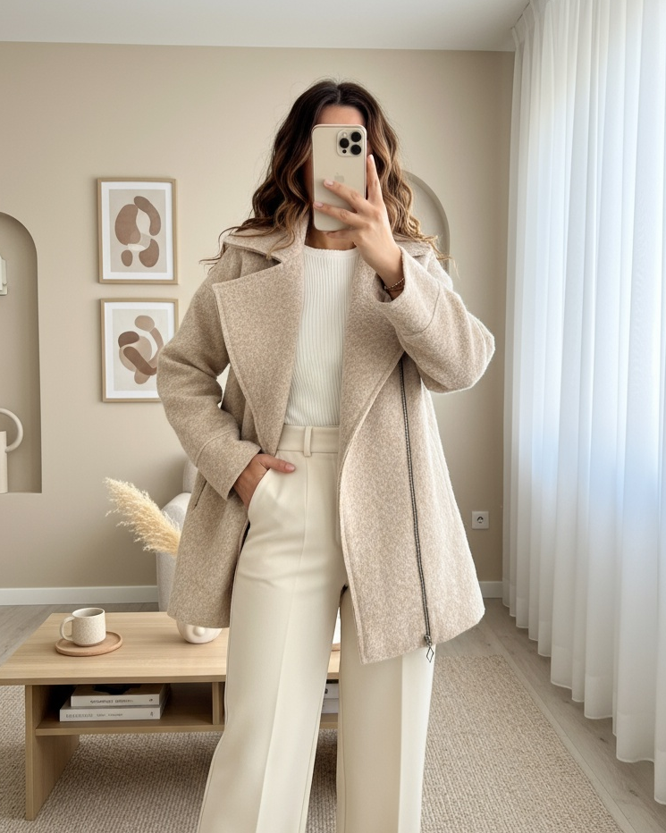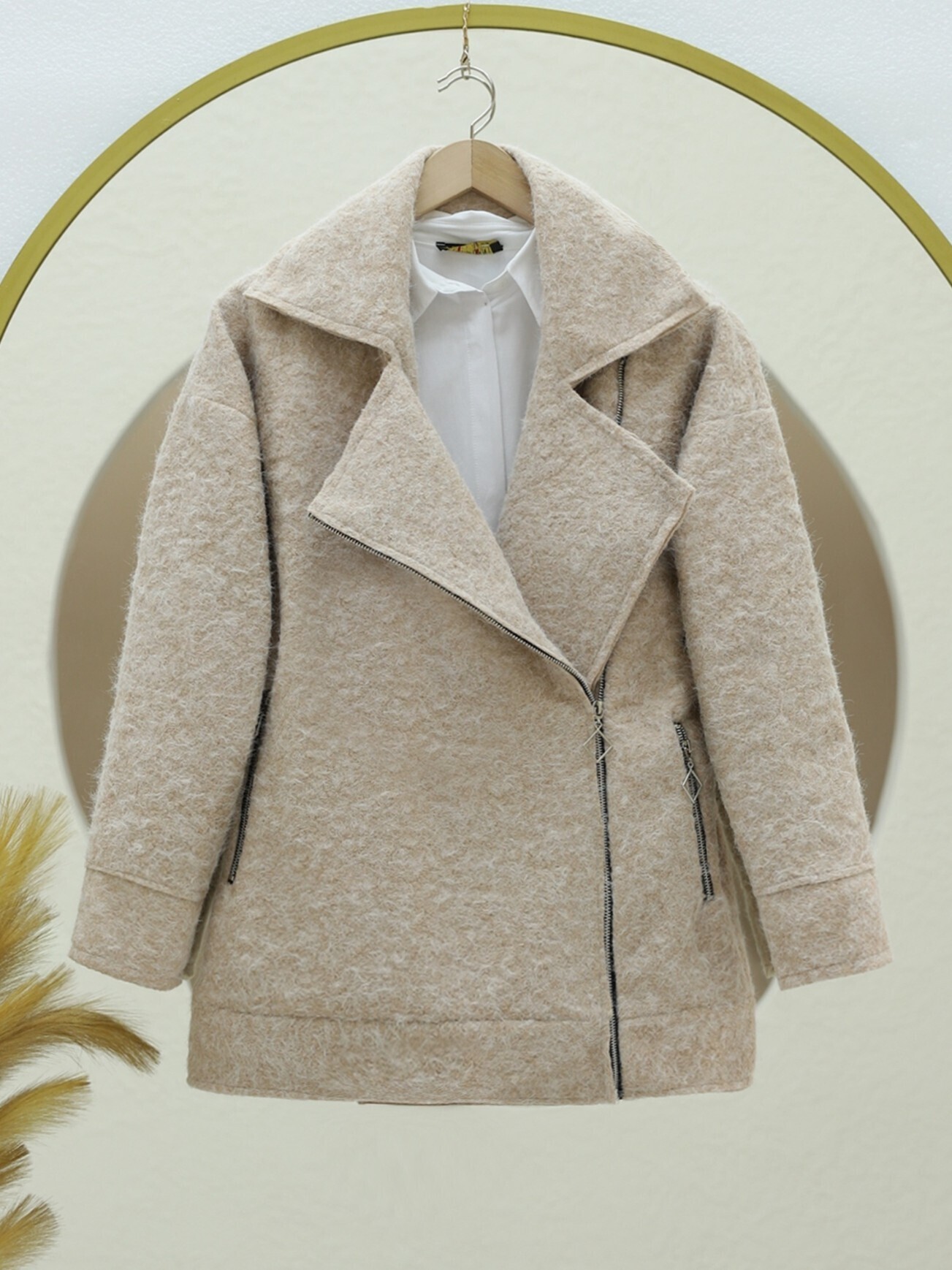 Önü Ve Cebi Fermuarlı Astarlı Buklet Ceket -Bej-Bej