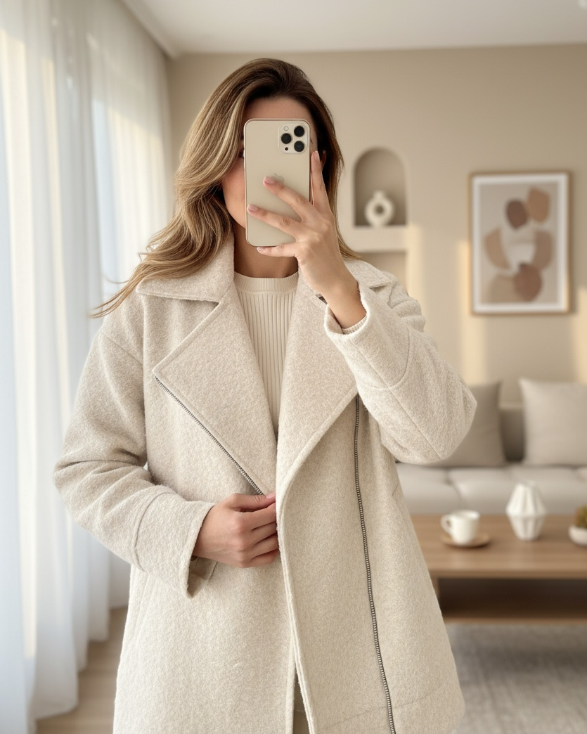 Önü Ve Cebi Fermuarlı Astarlı Buklet Ceket -Krem-Krem