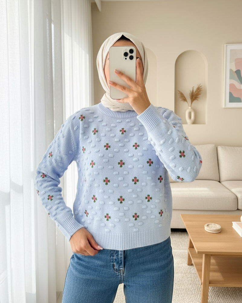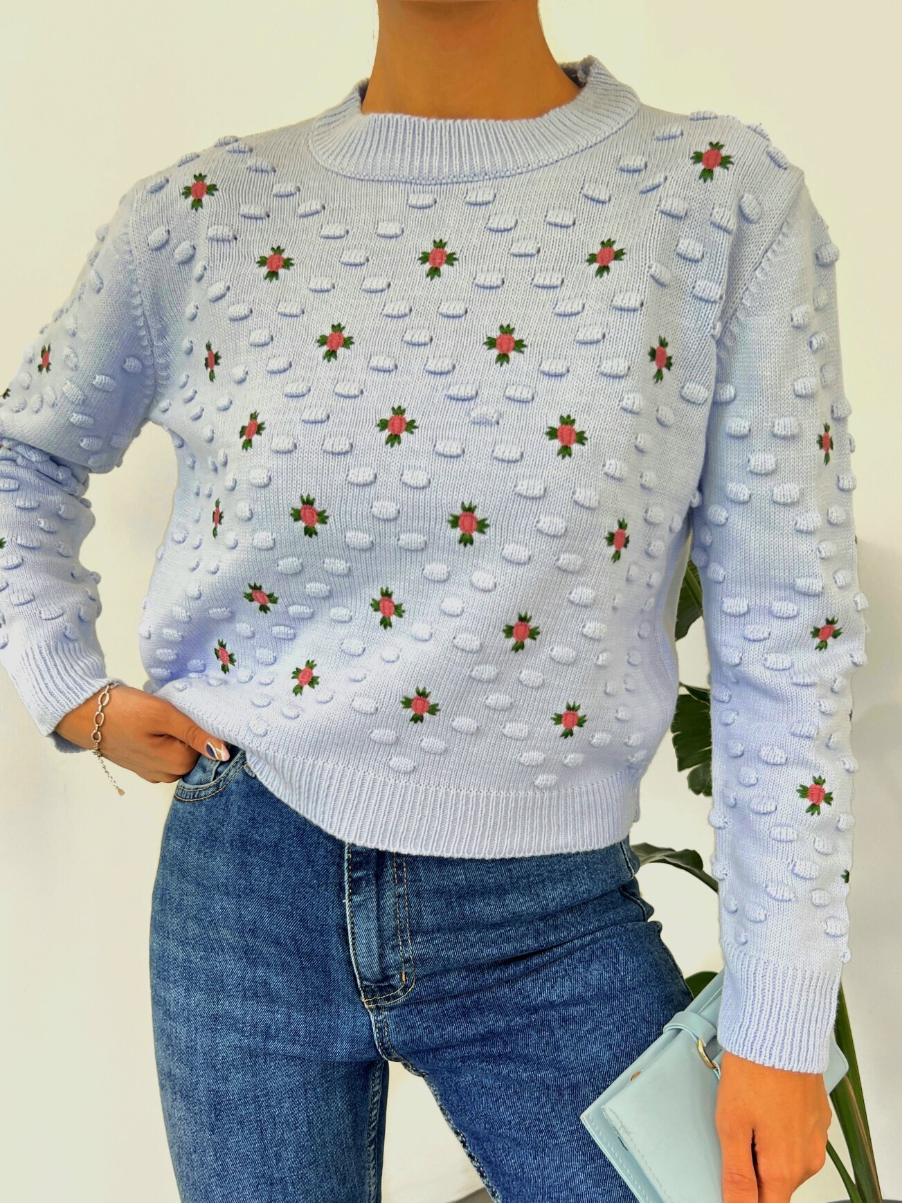 Önü Ve Kolları Ponponlu Triko Kazak -Açık Mavi-Açık Mavi