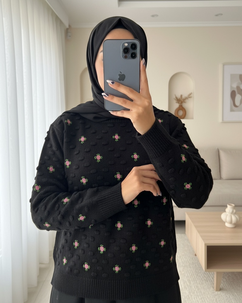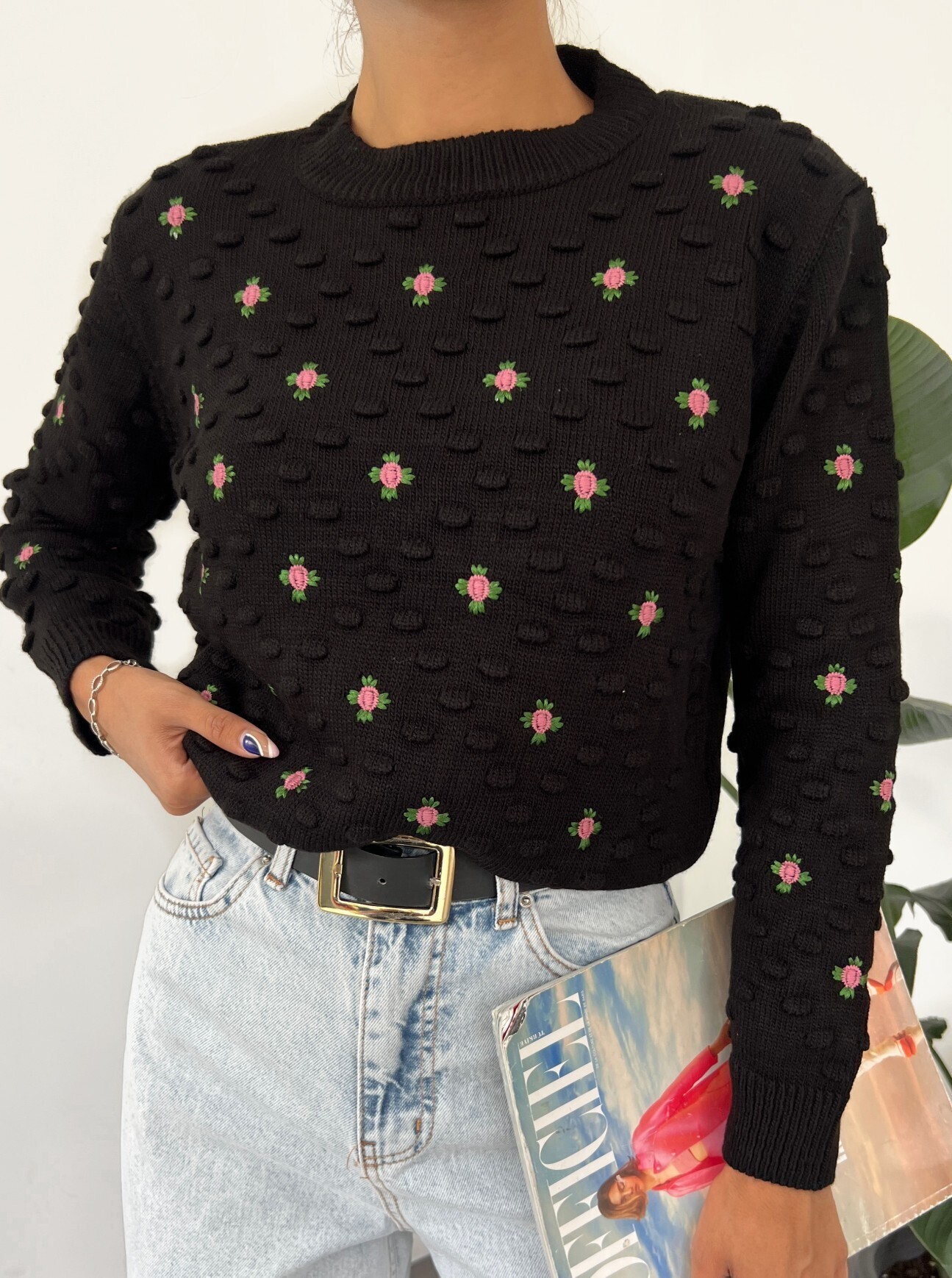 Önü Ve Kolları Ponponlu Triko Kazak -Siyah-Siyah
