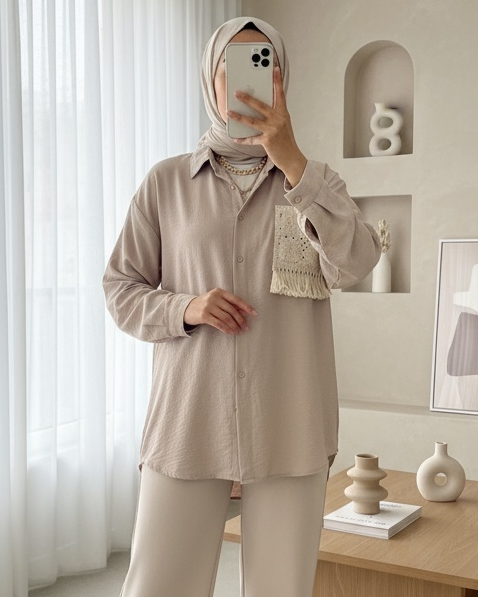 Örgü Cepli Düğmeli Ayrobin Gömlek -Açık Vizon-Açık Vizon
