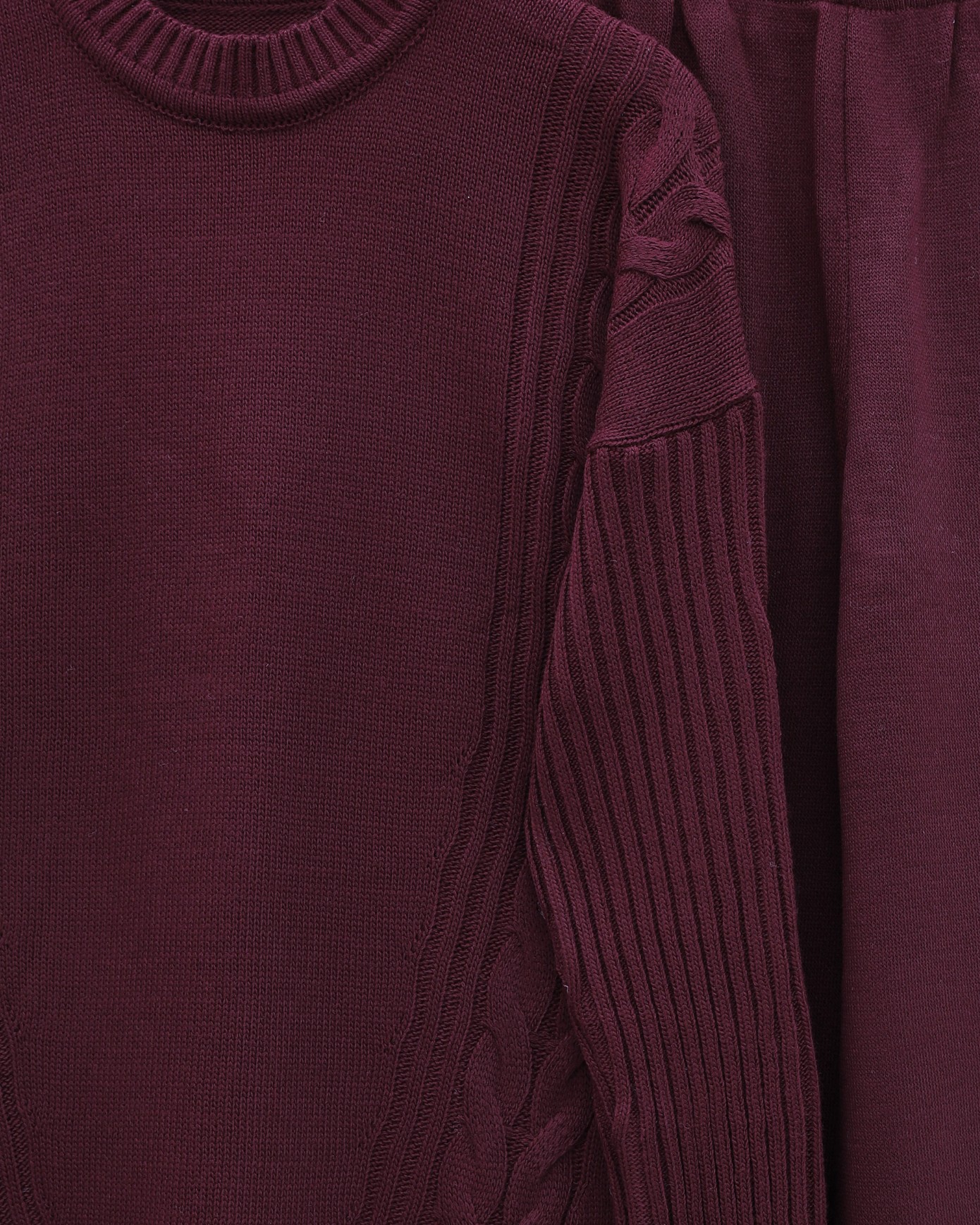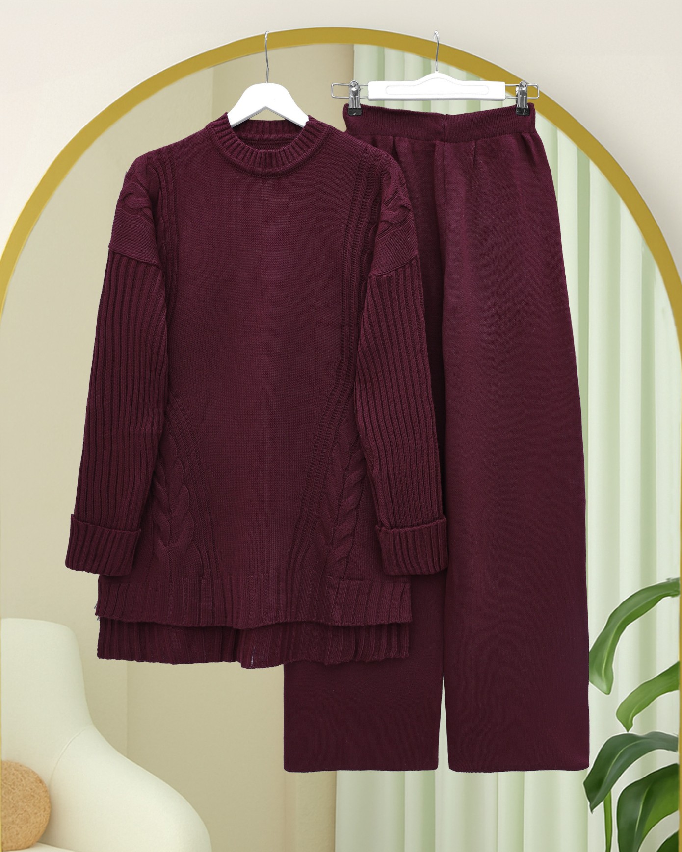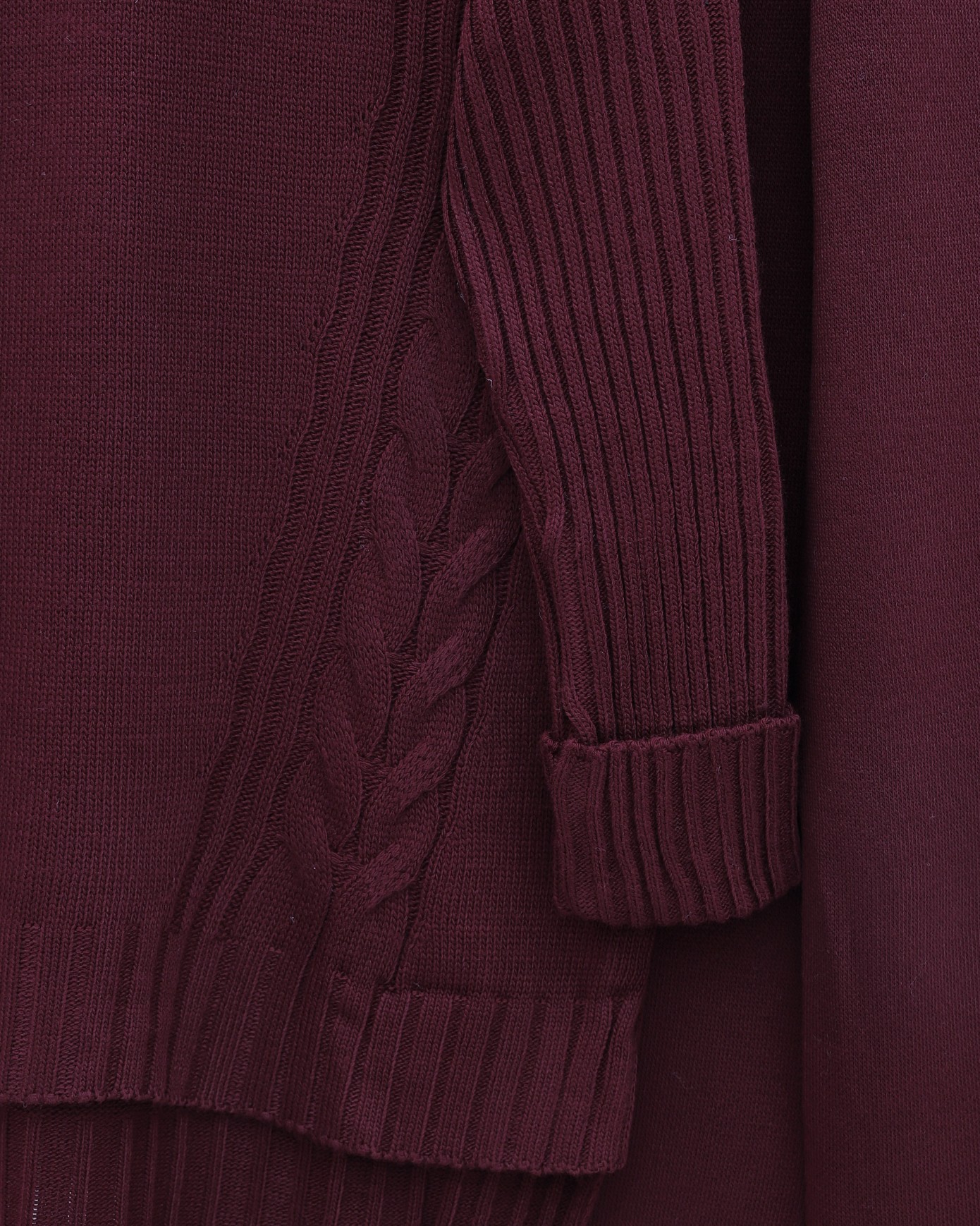 Örgü Desenli Arkası Uzun Triko Takım -Bordo-Bordo