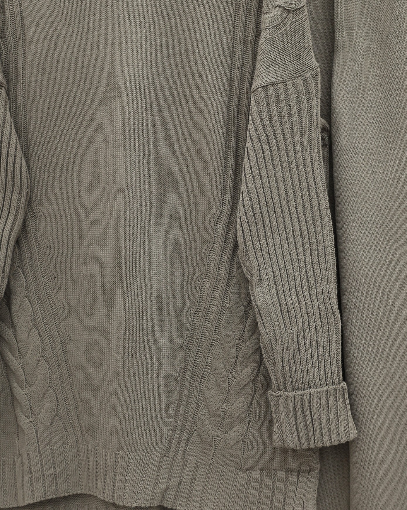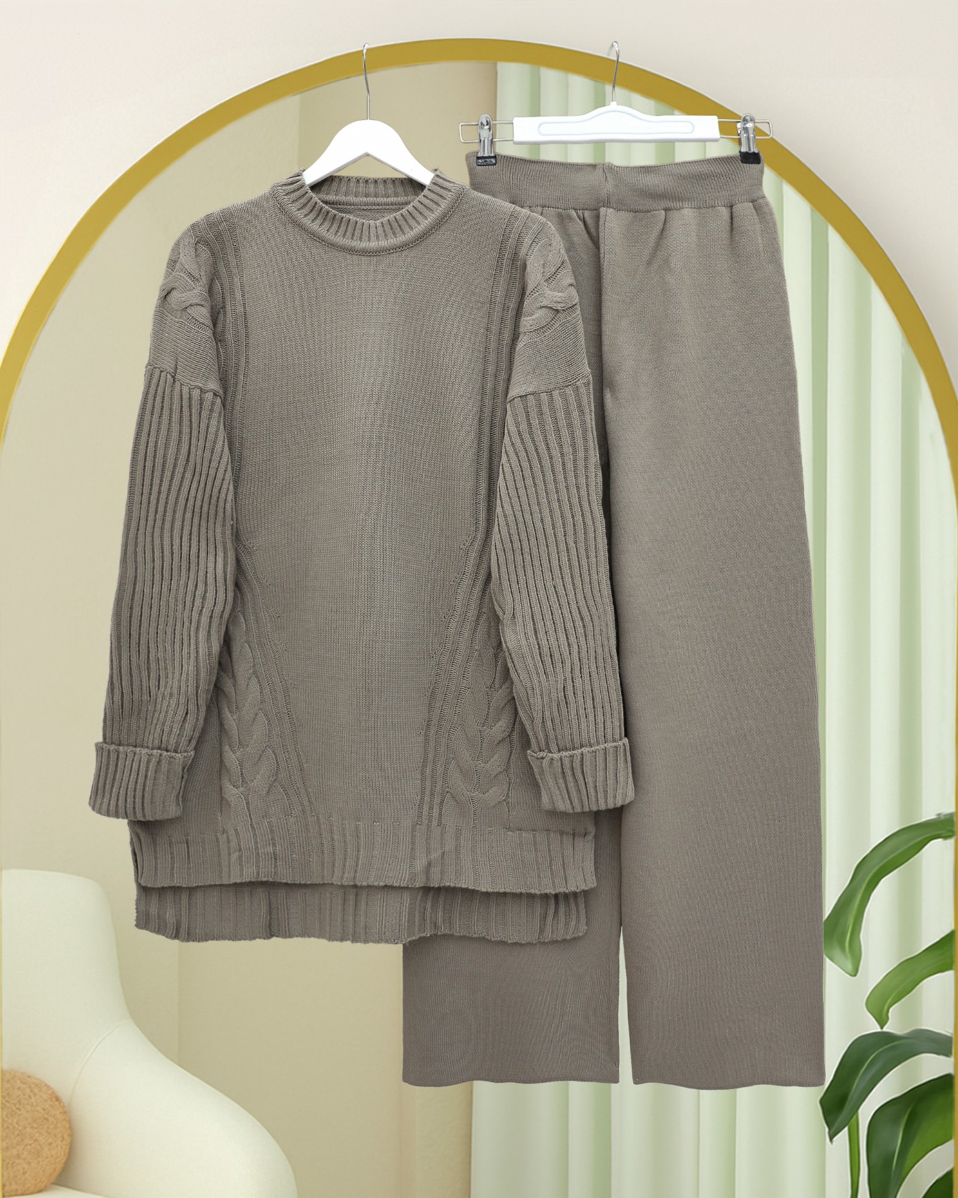 Örgü Desenli Arkası Uzun Triko Takım -Toprak-Toprak