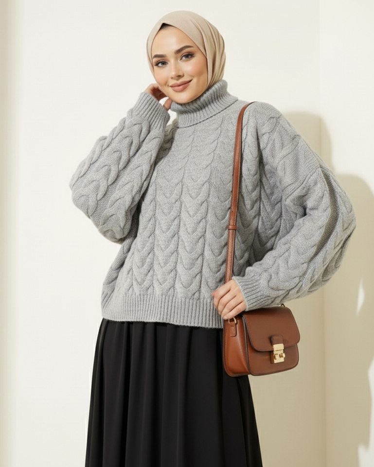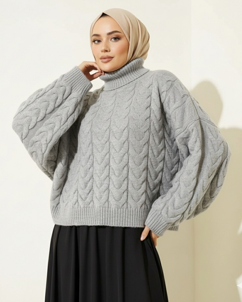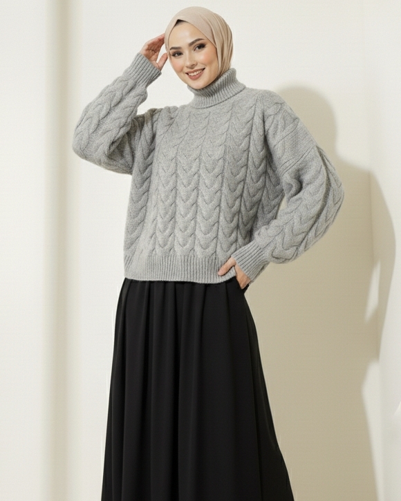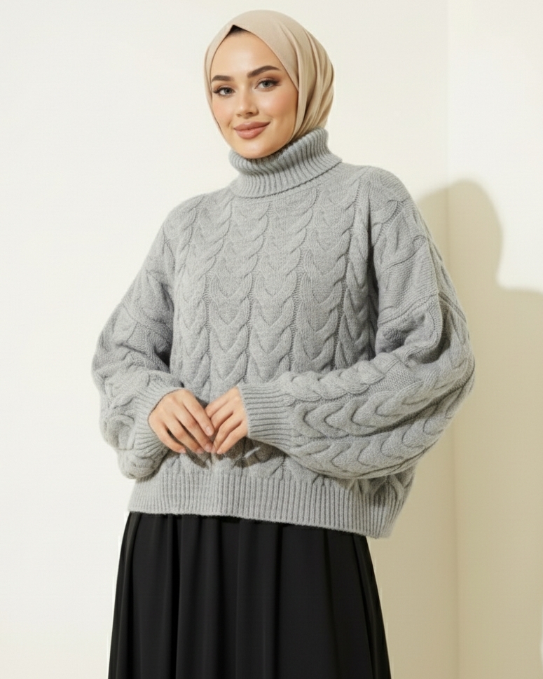 Örgü Desenli Boğazlı Triko Kazak -Gri-Gri