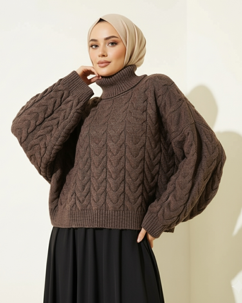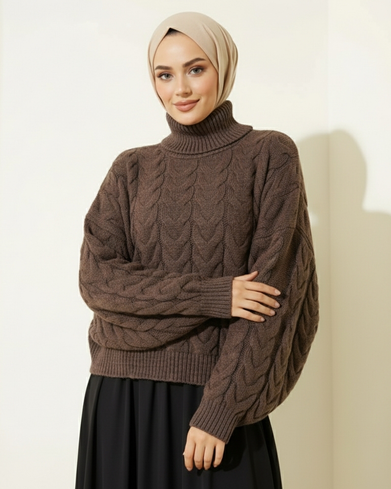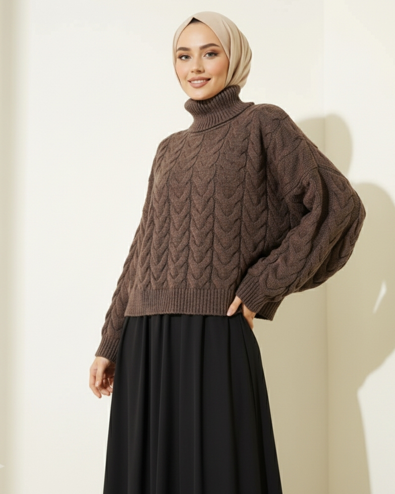 Örgü Desenli Boğazlı Triko Kazak -Kahve-Kahve