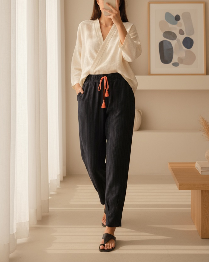 Paçası Pens Dikişli Bağcık Detaylı Pantolon -Siyah-Siyah