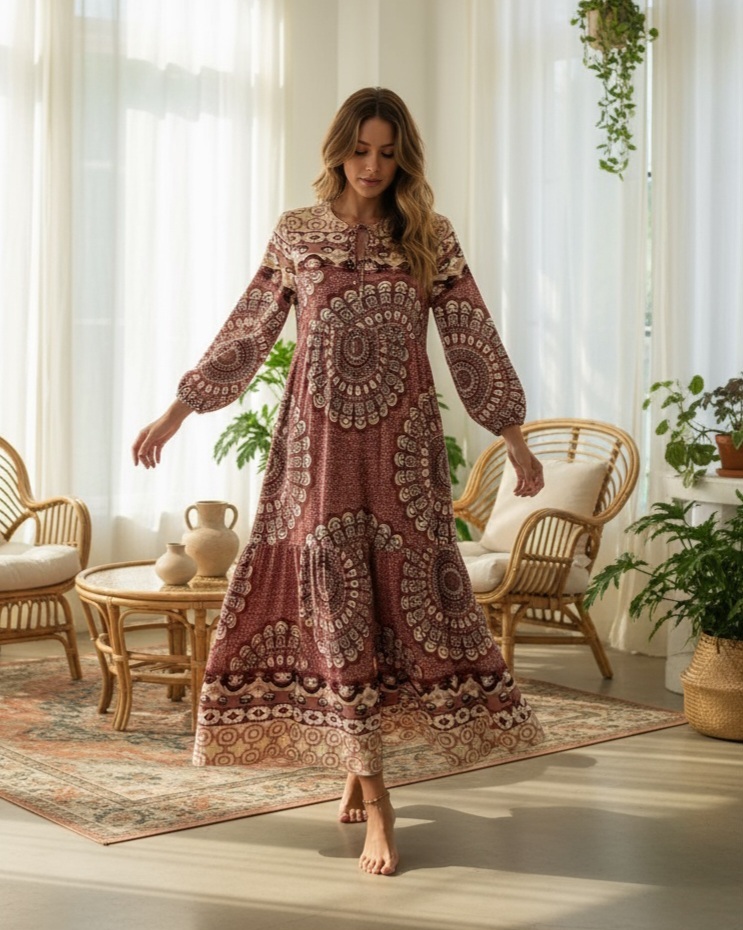 Parçalı Deseli Bağcıklı Kolu Lastikli Elbise -G.Kurusu-G.Kurusu