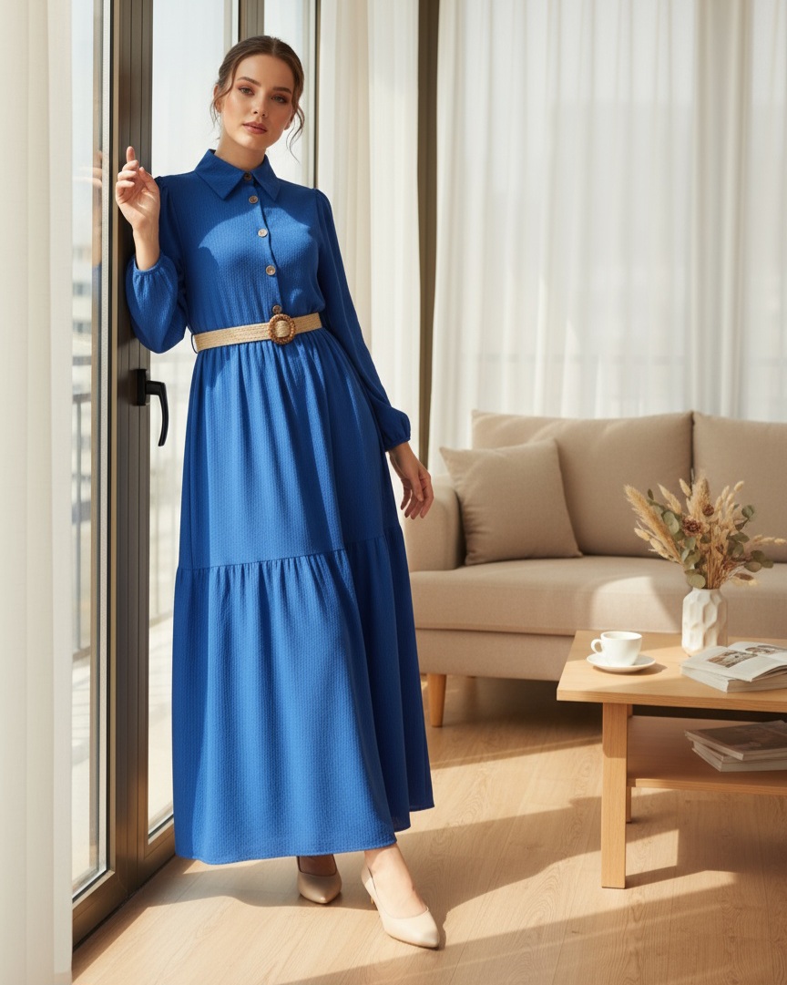 Parçalı Yarım Düğmeli Kemerli Krinkıl Elbise -Koyu Mavi-Koyu Mavi