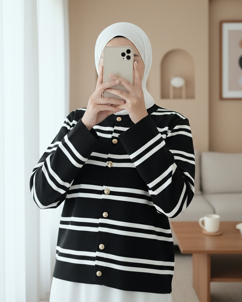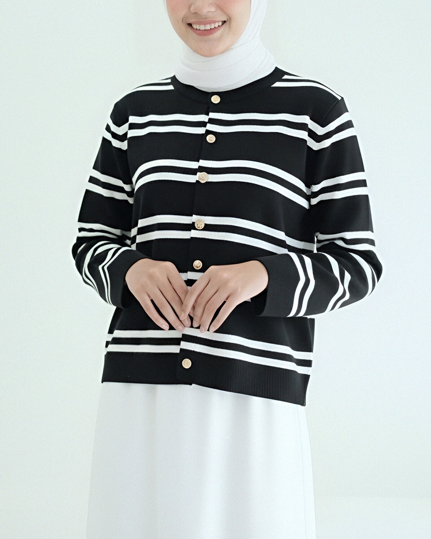 Parlak Düğmeli Çizgili Triko Hırka -Siyah-siyah