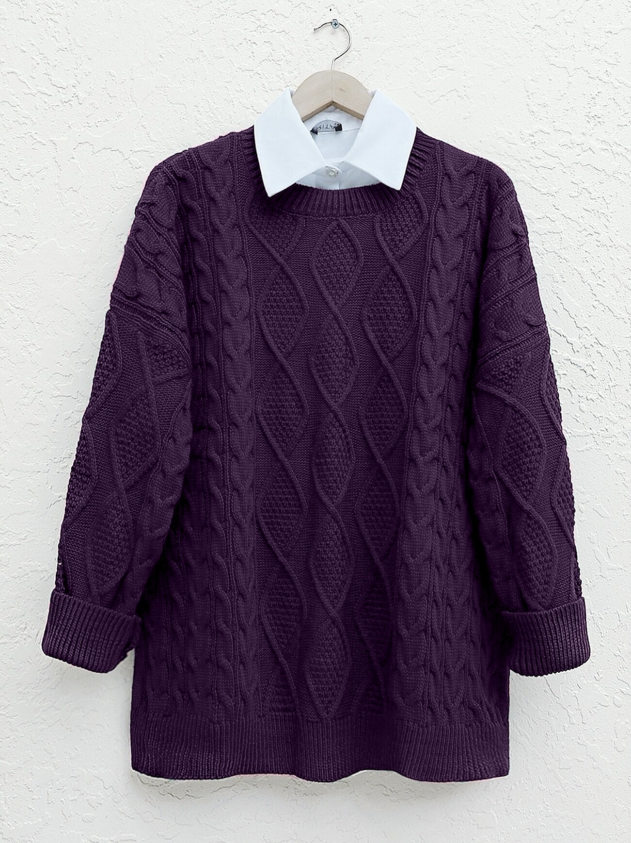 Petek Desen Kışlık Salaş Triko Kazak -Mor-Mor