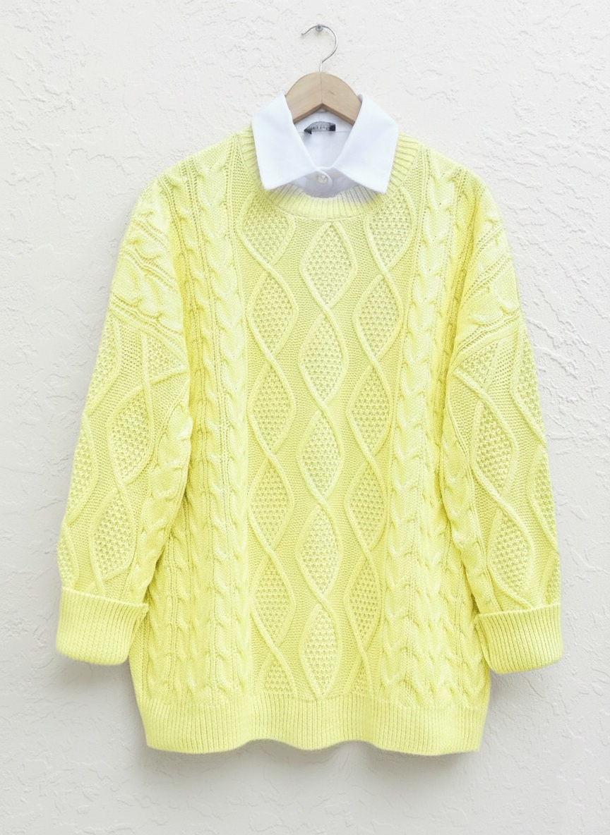 Petek Desen Kışlık Salaş Triko Kazak -Sarı-Sarı