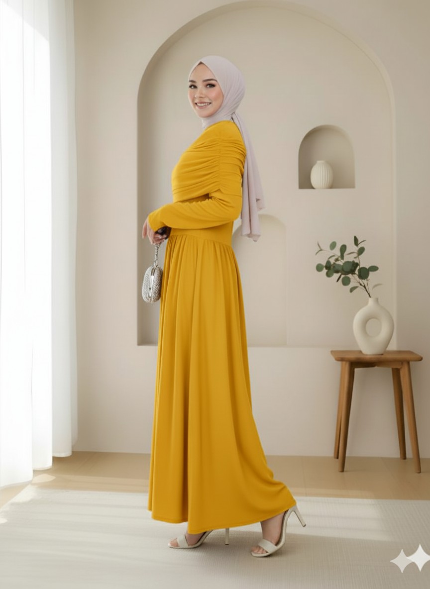 Pile Detaylı Uzun Sandy Elbise -Sarı-Sarı