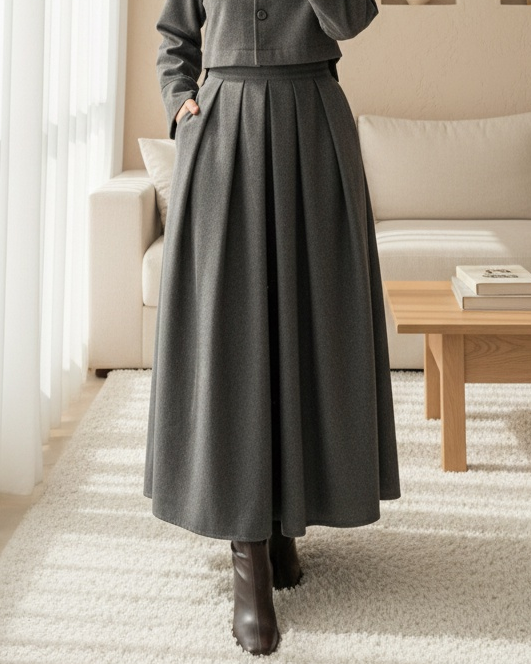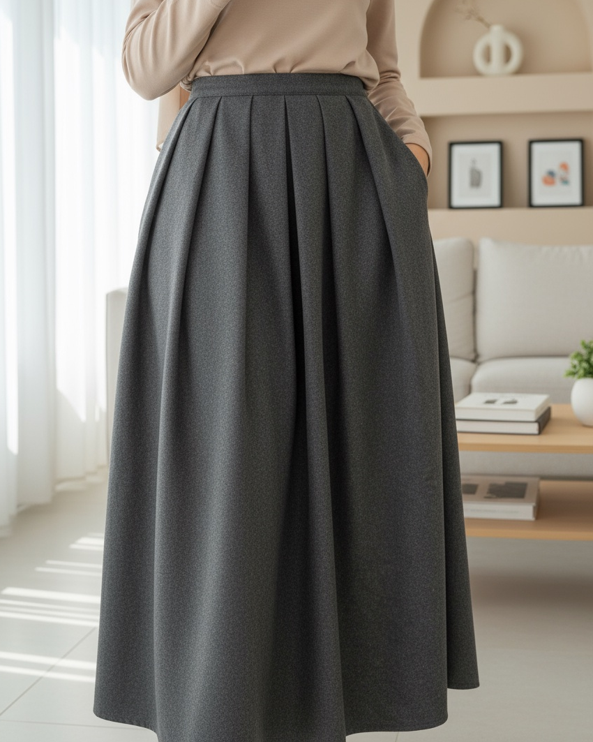 Pileli Fermuarlı Kaşe Etek -Füme-Füme