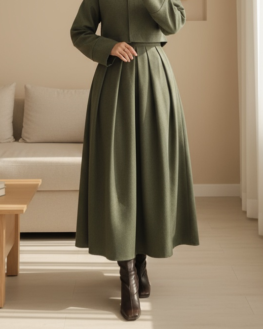 Pileli Fermuarlı Kaşe Etek -Haki-Haki
