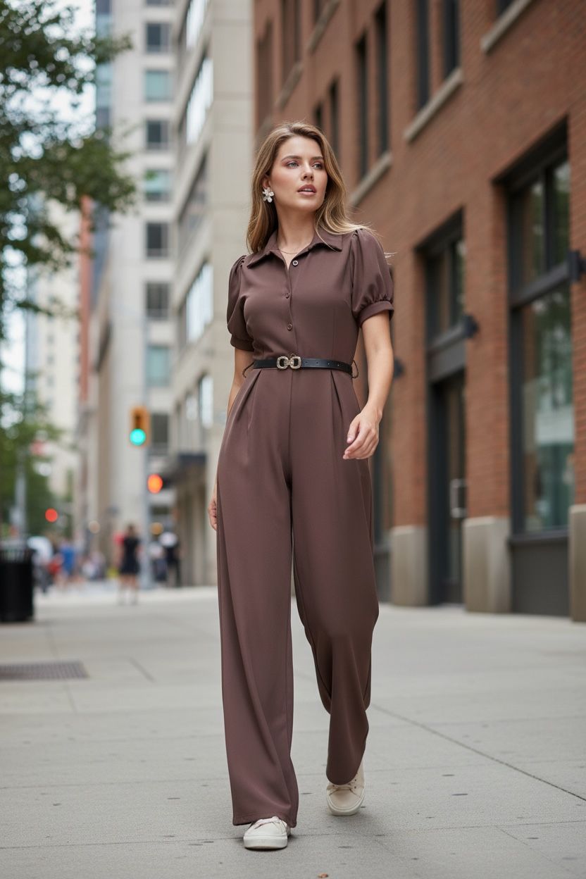 Pileli Gömlek Yaka Kemerli Tulum Acı Kahve - 4567-Acı Kahve