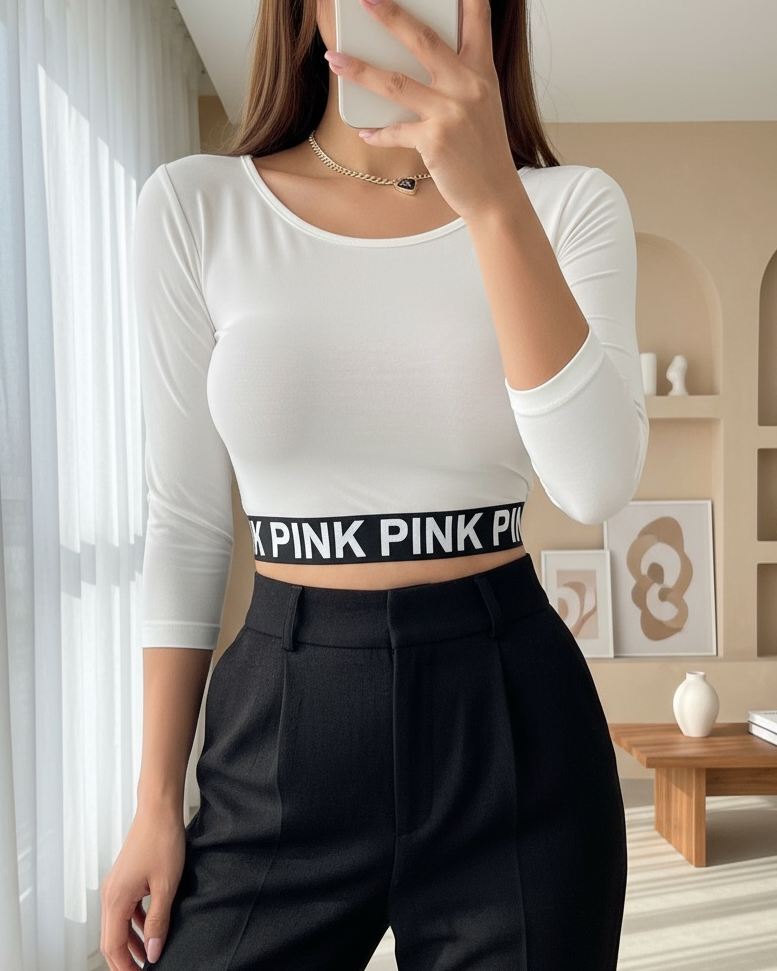 Pink Yazılı Fakir Kol Lastikli Crop -Ekru-Ekru