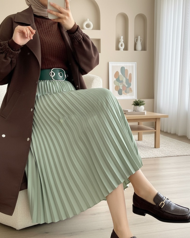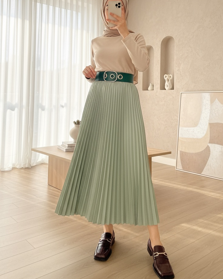 Pliseli Beli Lastikli Etek -Su Yeşili-Su Yeşili
