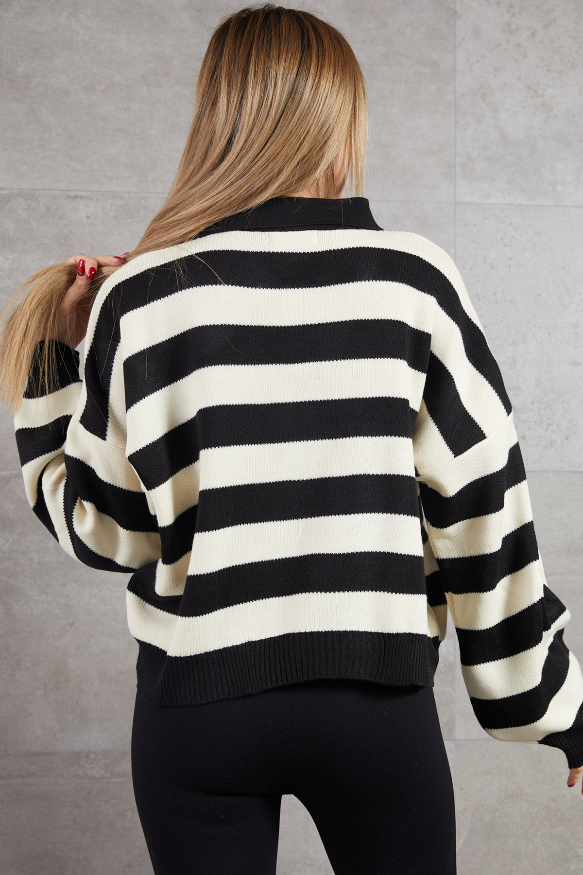 Polo Yaka Çizgili Triko Kazak-Siyah