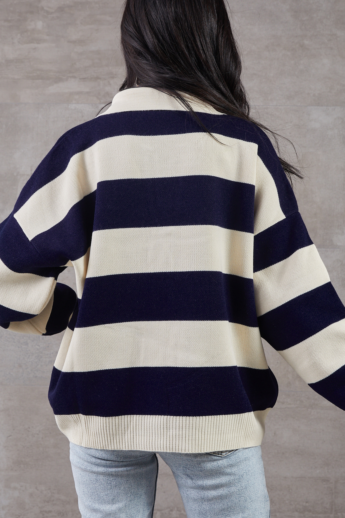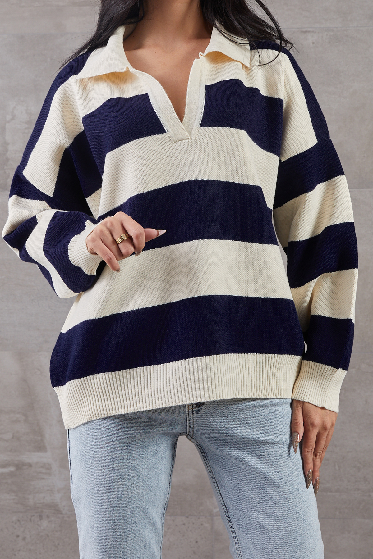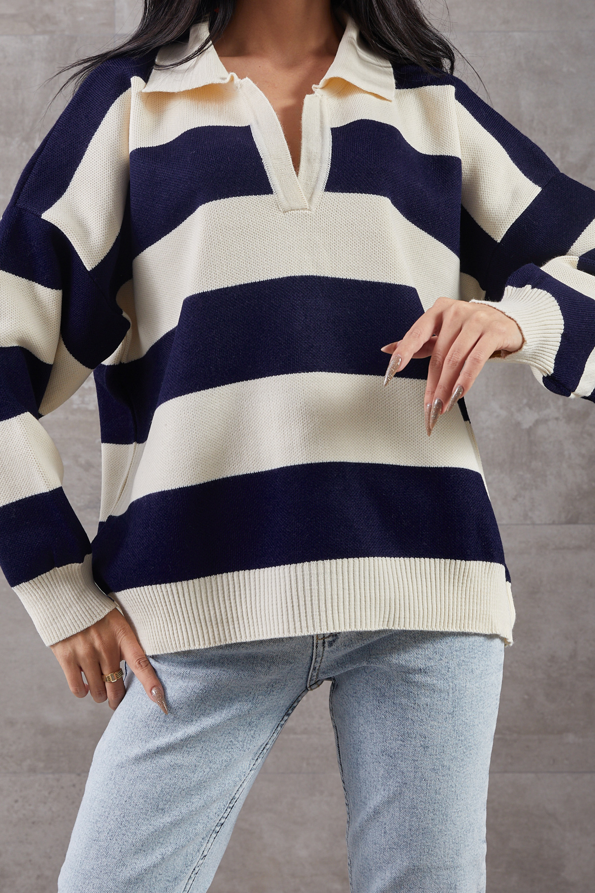 Polo Yaka Çizgili Triko Kazak-Lacivert