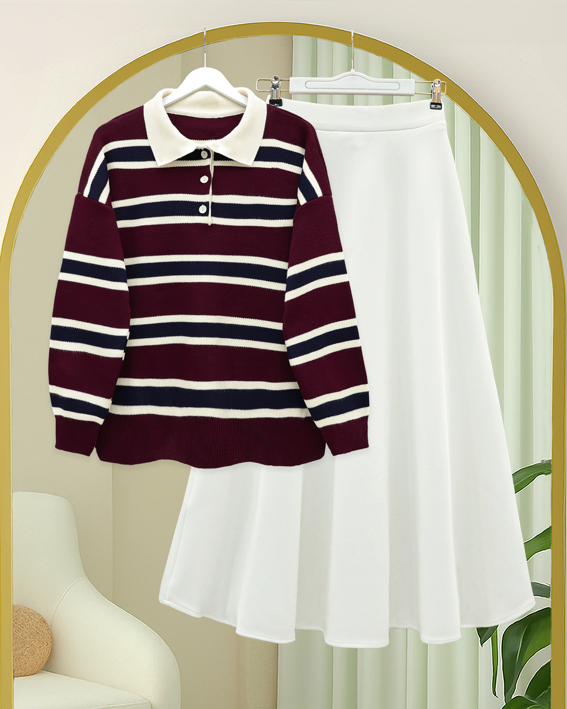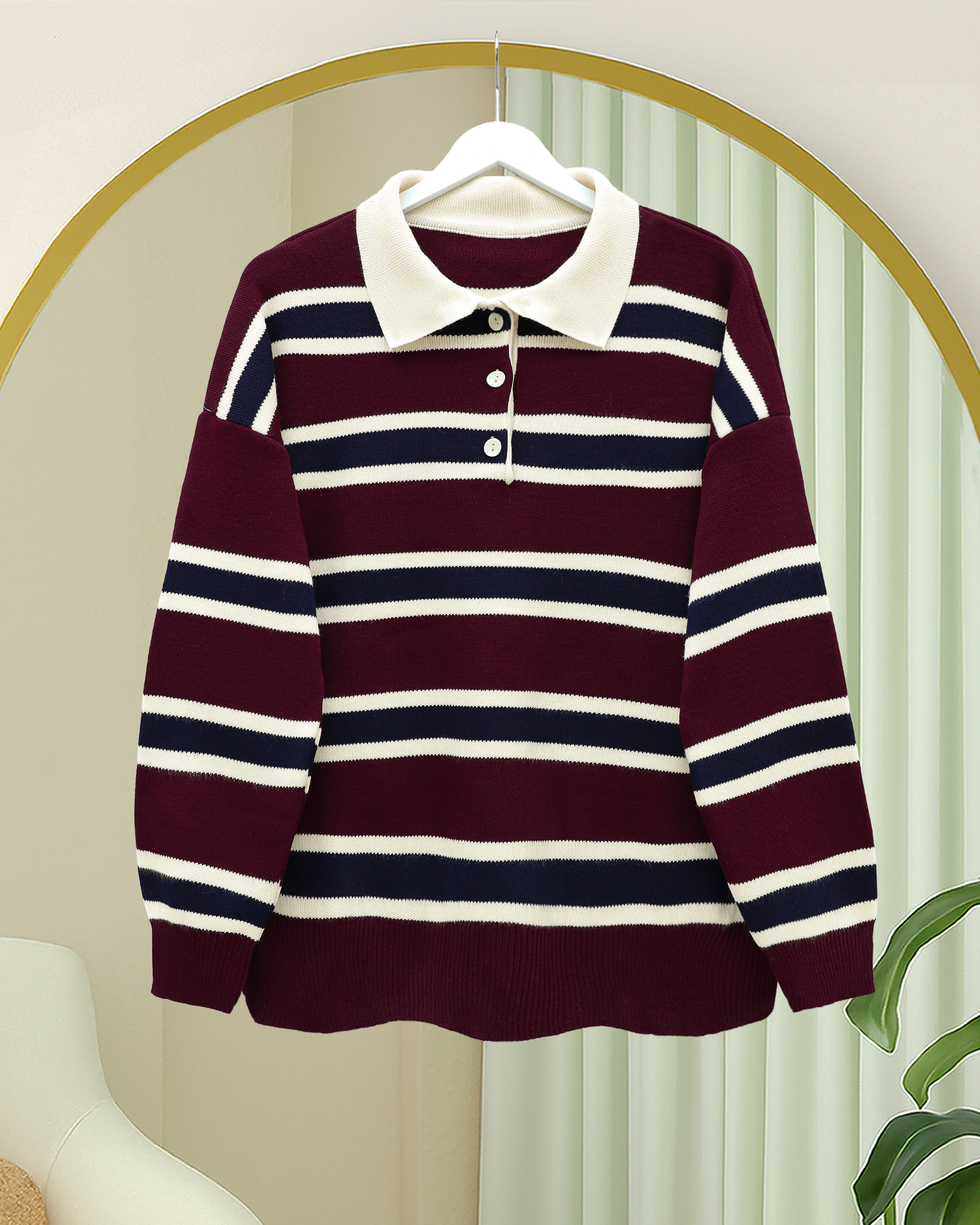 Polo Yaka Düğmeli Renkli Çizgili Triko Kazak -Bordo-Bordo