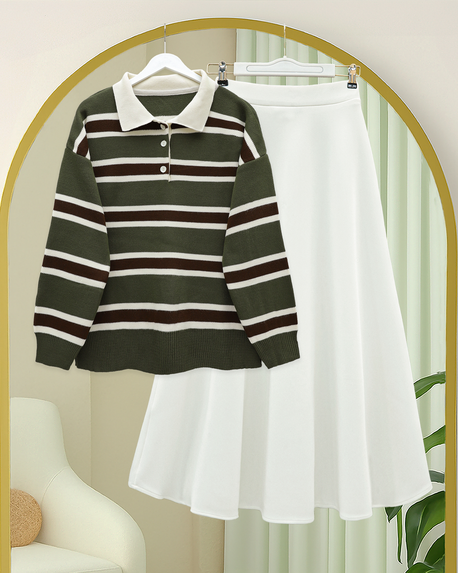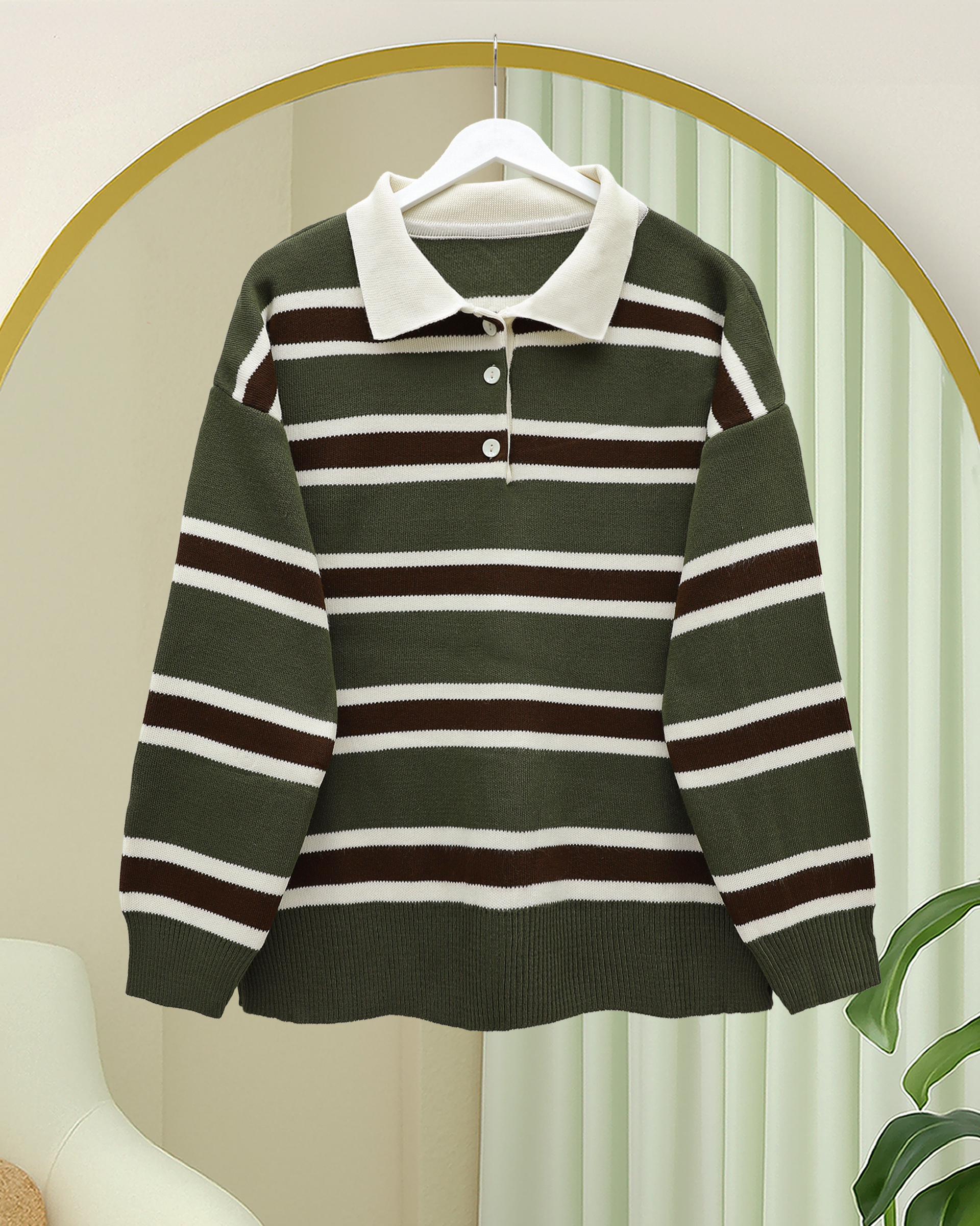 Polo Yaka Düğmeli Renkli Çizgili Triko Kazak -Haki-Haki