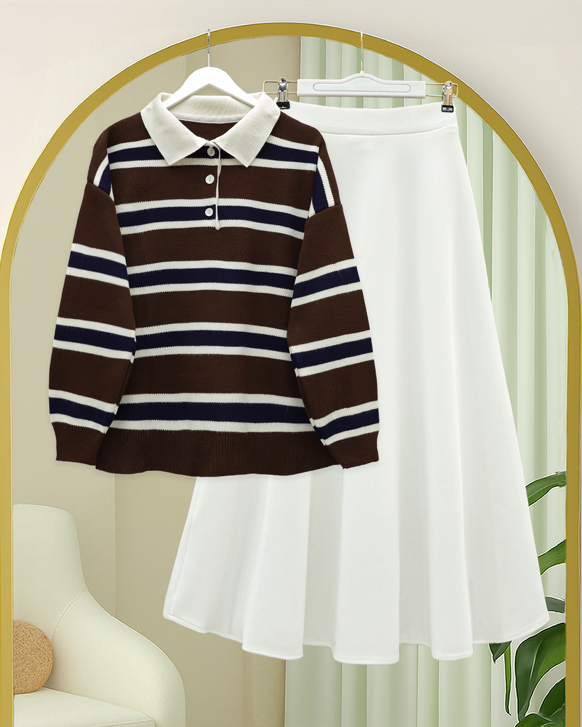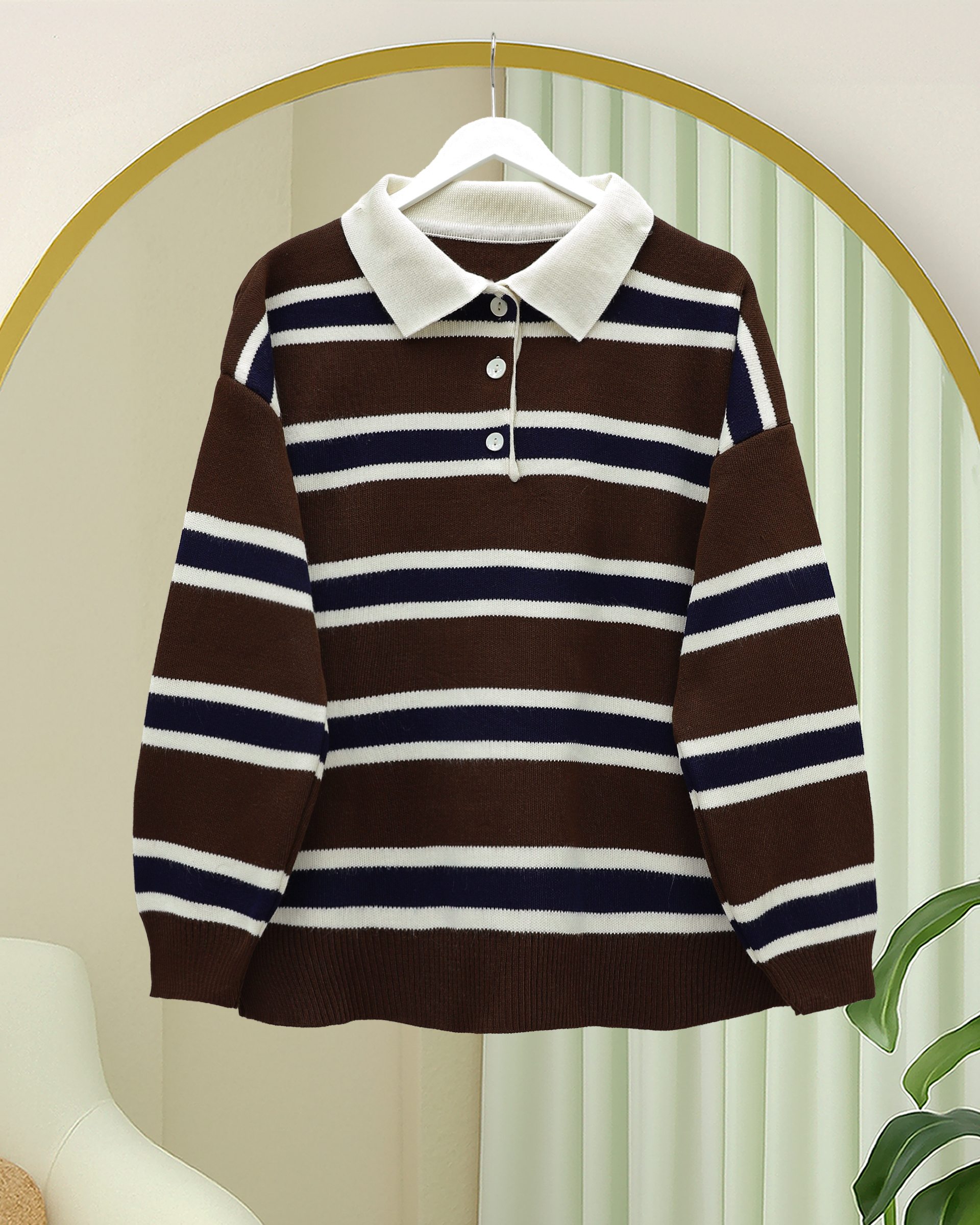 Polo Yaka Düğmeli Renkli Çizgili Triko Kazak -Kahve-Kahve