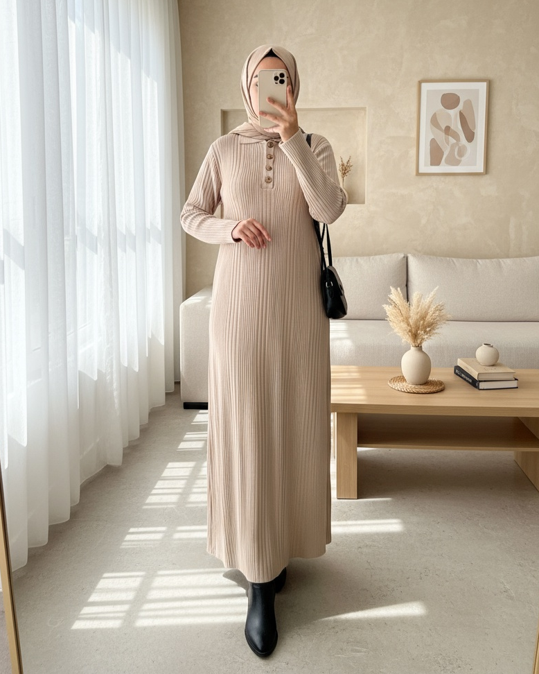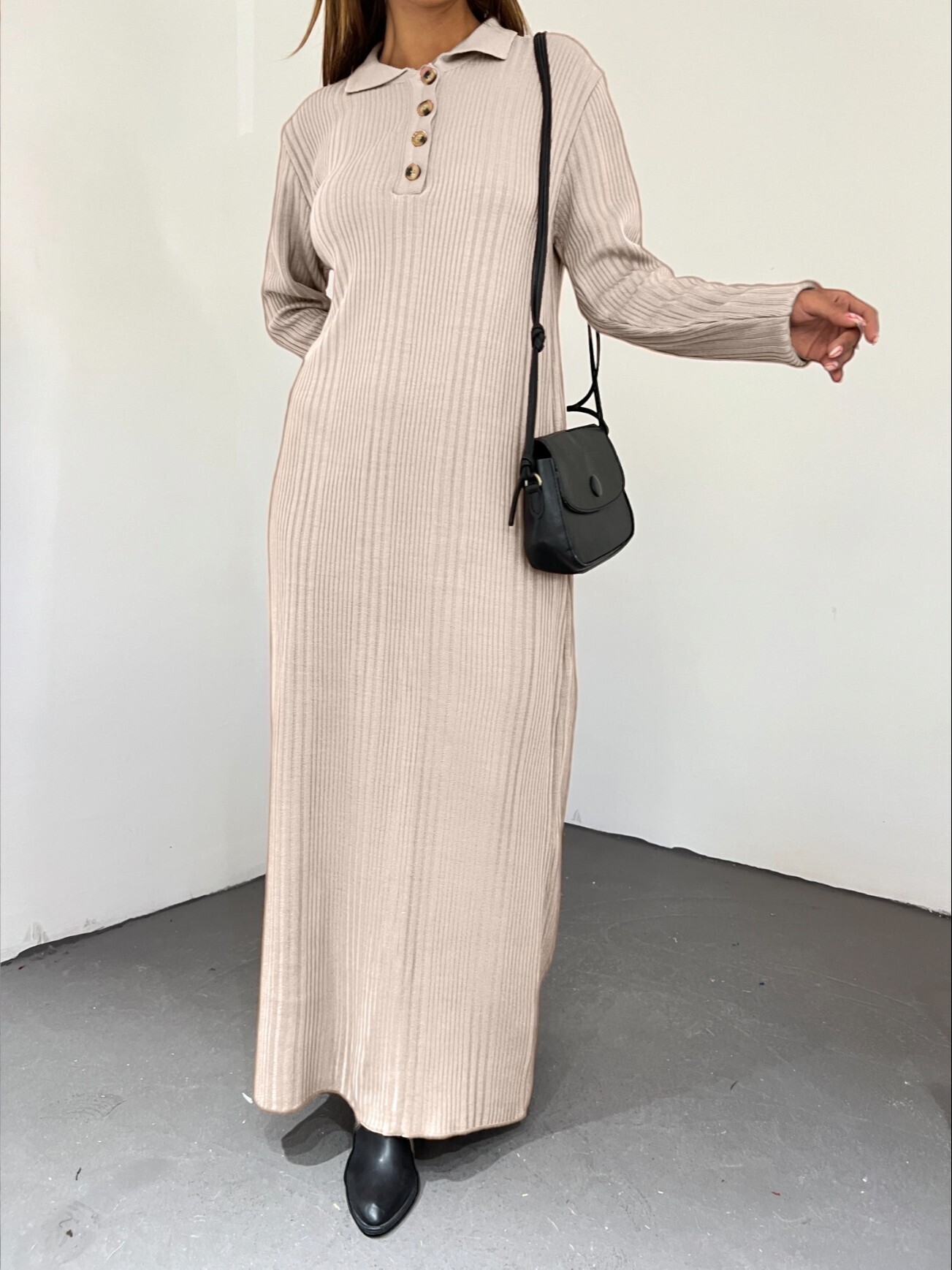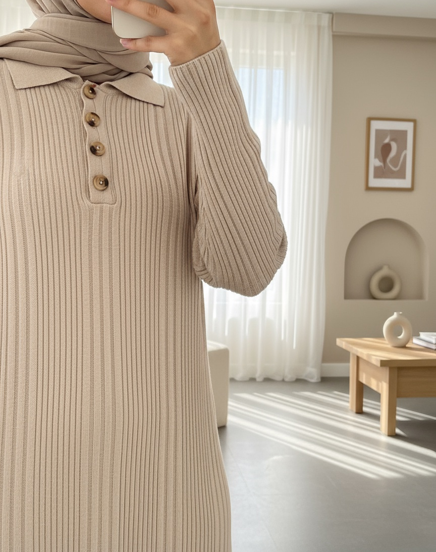Polo Yaka Düğmeli Triko Elbise -Taş-Taş