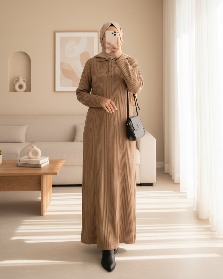 Polo Yaka Düğmeli Triko Elbise -Vizon-Vizon