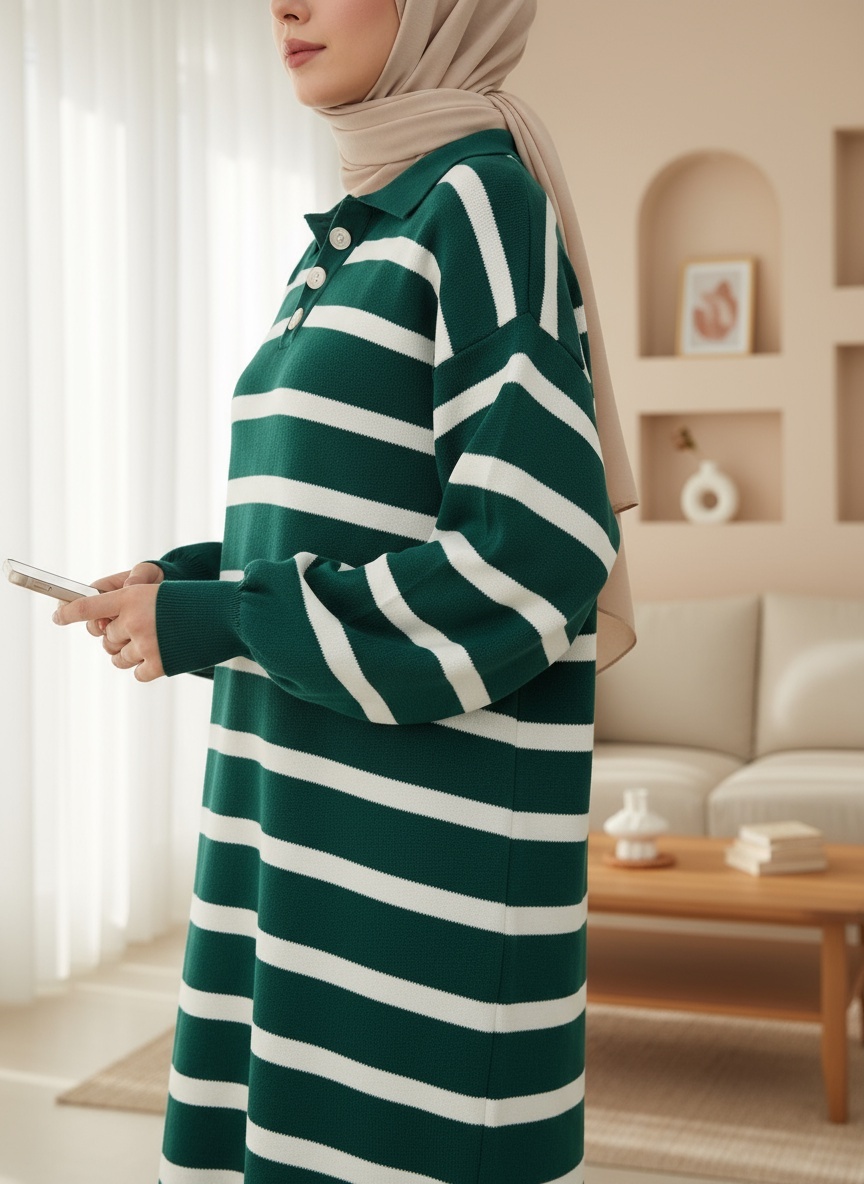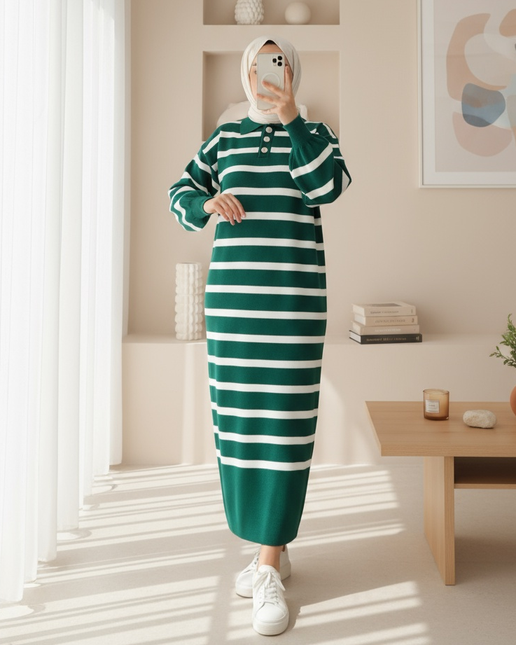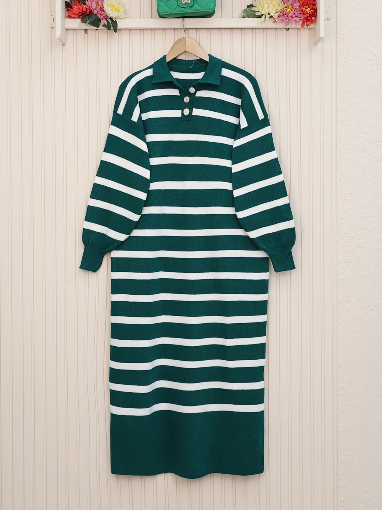 Polo Yaka Düğmeli Triko Elbise -Zümrüt-Zümrüt