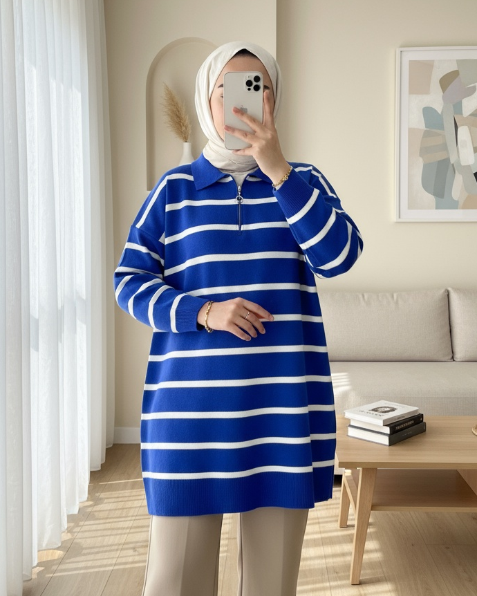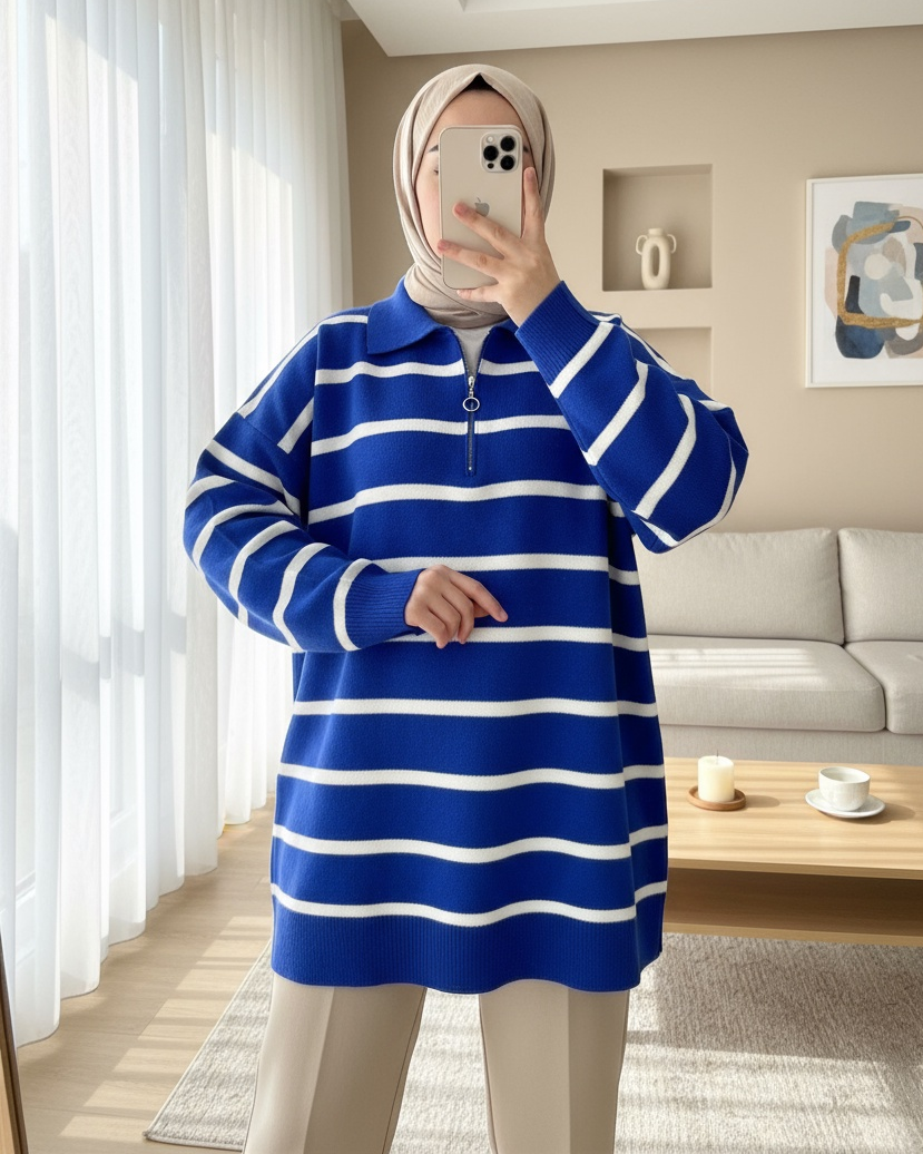 Polo Yaka Fermuarlı Triko Tunik -Saks-Saks