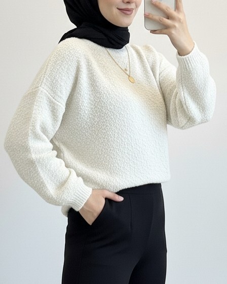 Ponpon Dokulu Salaş Triko Kazak -Ekru-Ekru