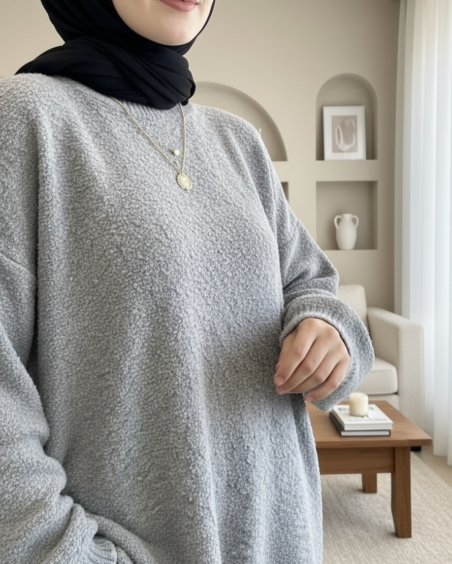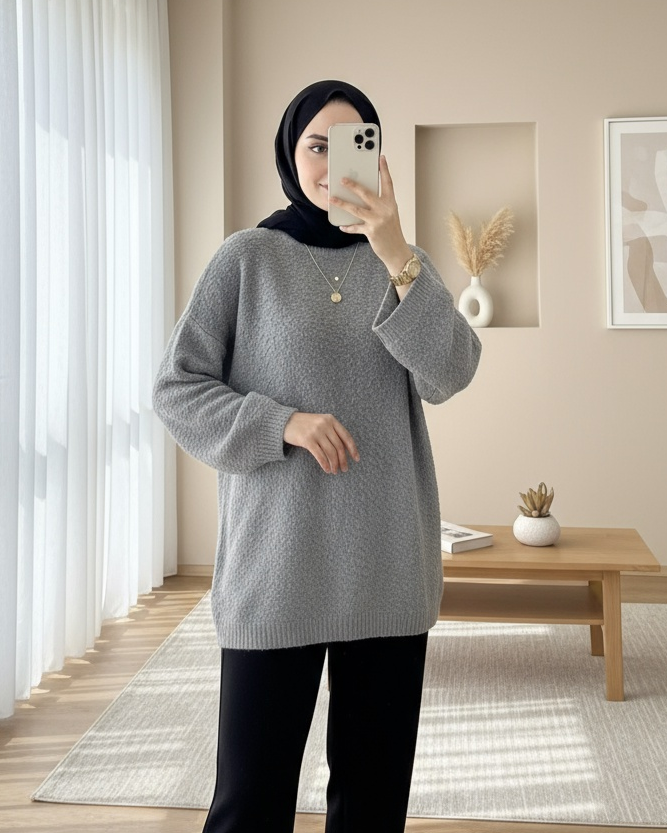 Ponpon Dokulu Salaş Triko Kazak -Gri-Gri