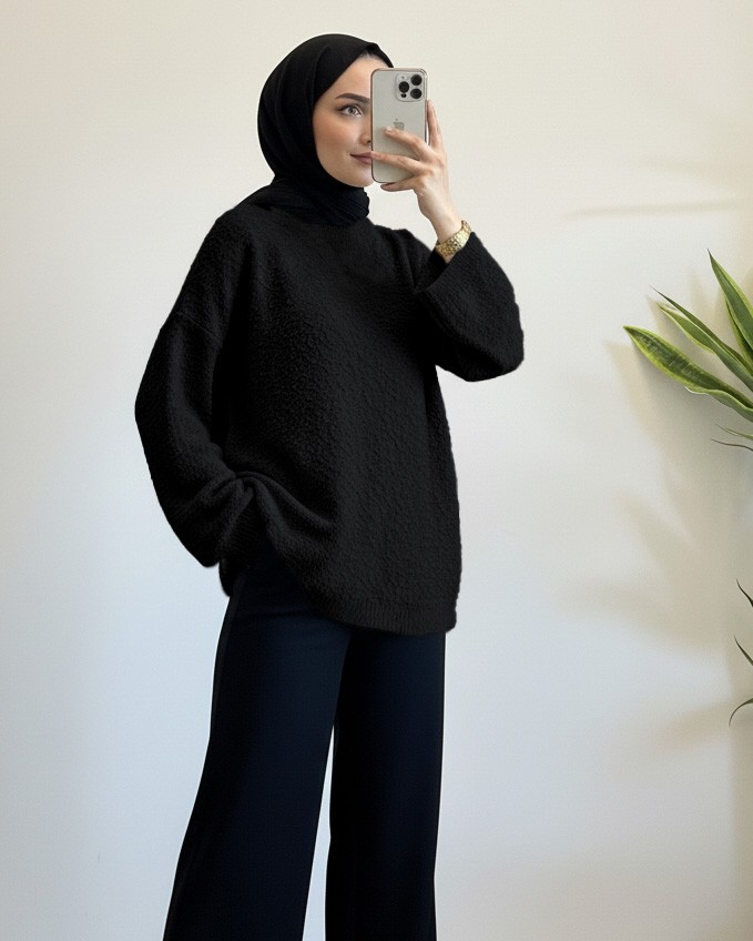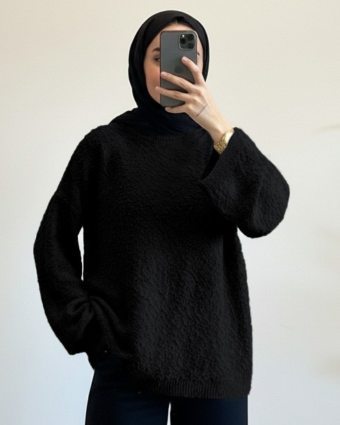 Ponpon Dokulu Salaş Triko Kazak -Siyah-siyah